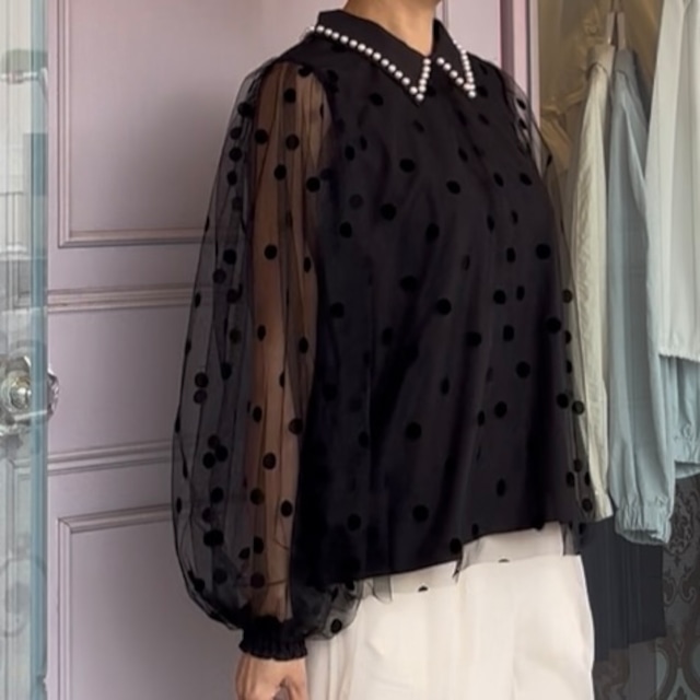 【トップス】フロッキードット襟パールトップス・ホワイト