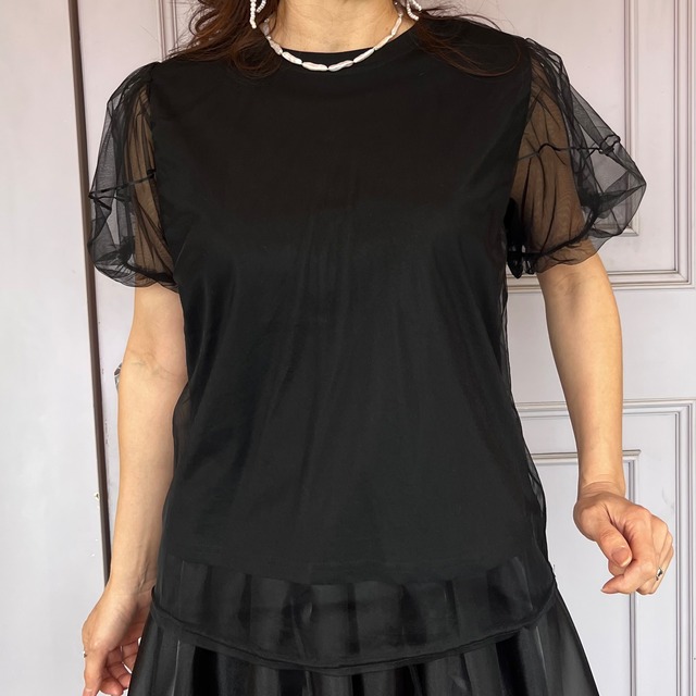 【トップス】チュールお袖ふんわりTシャツ・ブラック