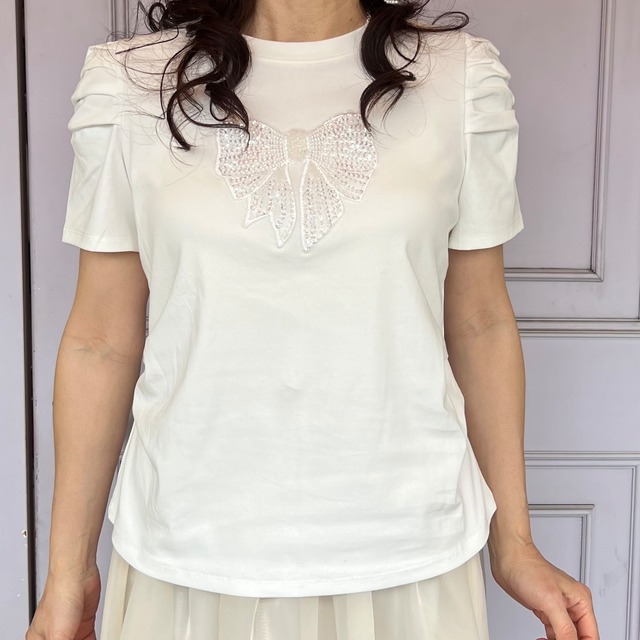 【トップス】Tシャツ生地 リボンビジュートップス・ホワイト
