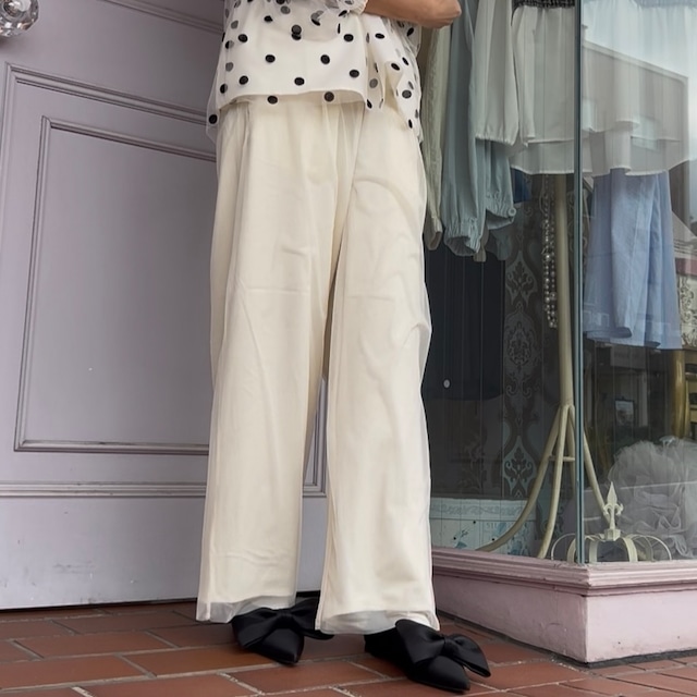 ■パンツ ■チュールワンド パンツ・ホワイト ■素材 ポリエステル92% ポリウレタン8% ■サイズ ウエスト68㎝-88㎝(ウエストゴム) ヒップ120cm 着丈95㎝ 股下62㎝ 両サイドポケットあり *ご注意事項* ・ハンドメイド商品のため、柄や位置に個体差がございます。 ・カラーによって、若干のサイズ誤差が生じる場合がございます。 ・光の加減やご使用のモニター環境により、実物と色味が異なって見えることがございます。 ・一部商品は実店舗と在庫を共有しております。 ・在庫ありの表示でも、ご注文後に欠品となる場合がございます。 ・完売や欠品の際は、ご迷惑をおかけしますがあらかじめご了承ください。 ・返品はお受けできませんので、サイズなどをよくご確認の上ご注文ください。