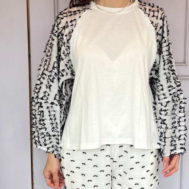 【トップス】リボン生地異素材ドッキングトップス・ホワイト