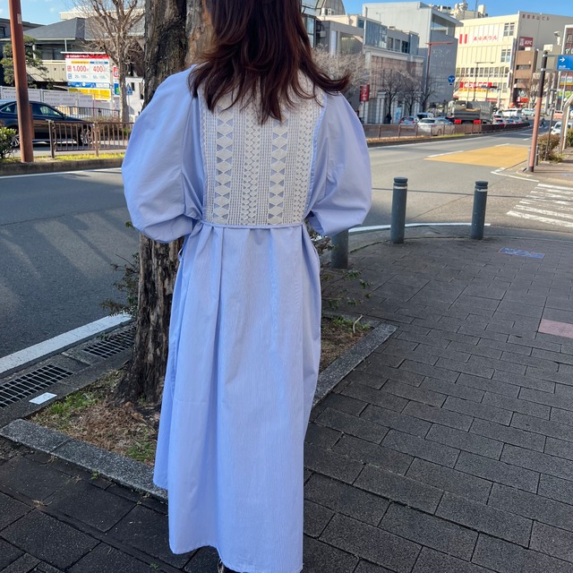 【ワンピース】フロントレース ストライプシャツワンピース・ブルー