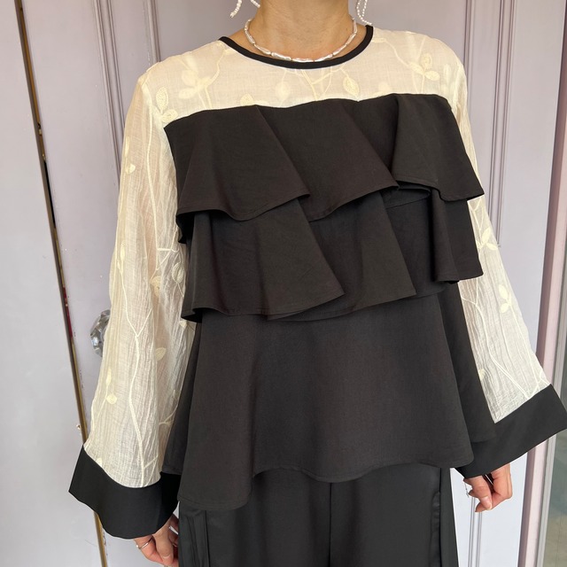【トップス】刺繍シアーフリルブラウス・ブラック