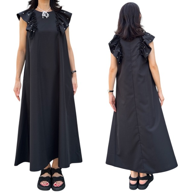 【ワンピース】Aラインフリルパールワンピース・ブラック