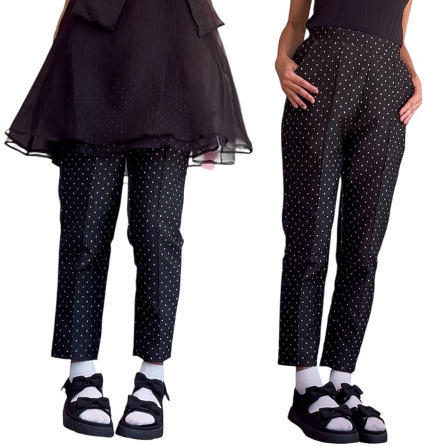 ■パンツ ■ミニドットパンツ・ブラック ■素材 ポリエステル100% ■サイズ ウエスト62㎝-80㎝(ウエストゴム) ヒップ102cm 着丈90㎝ 股下62㎝ 収縮性なし 両サイドポケットあり *ご注意事項* ■ハンドメイド商品の為位置は個々に異なります。 ■カラーにより多少のサイズ誤差がございます。 ■光の関係で実際の商品との色誤差が生じる場合がございます。 ■掲載商品につきましては、一部店頭在庫(実店舗)と共有している商品もございます。 ■在庫有りの場合であっても、ご注文後に欠品が発生する場合がございます。 ■完売や欠品の場合は、誠にご迷惑をお掛けいたしますが、予めご了承下さい。 ■返品は出来ませんのでサイズを目安にご検討下さい。
