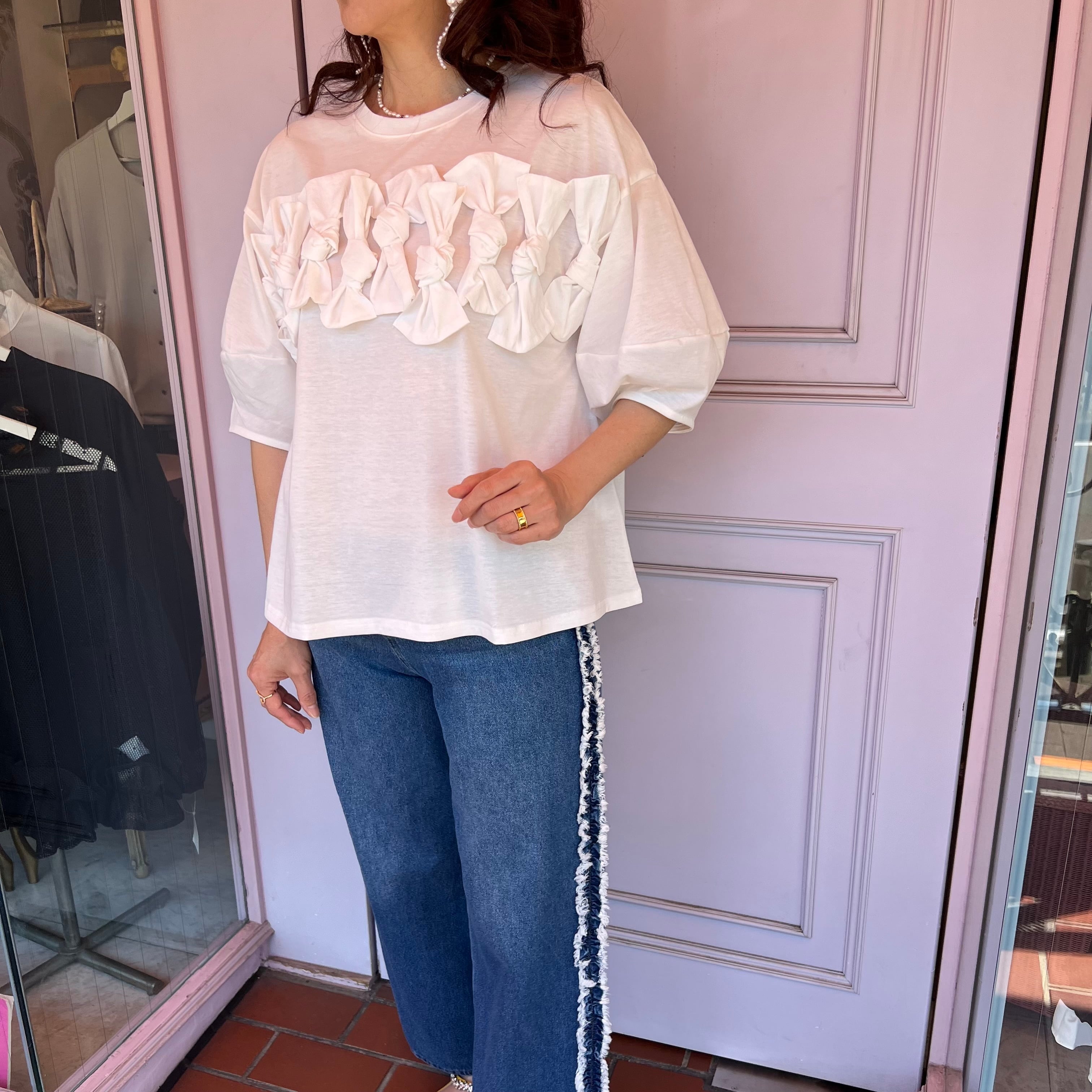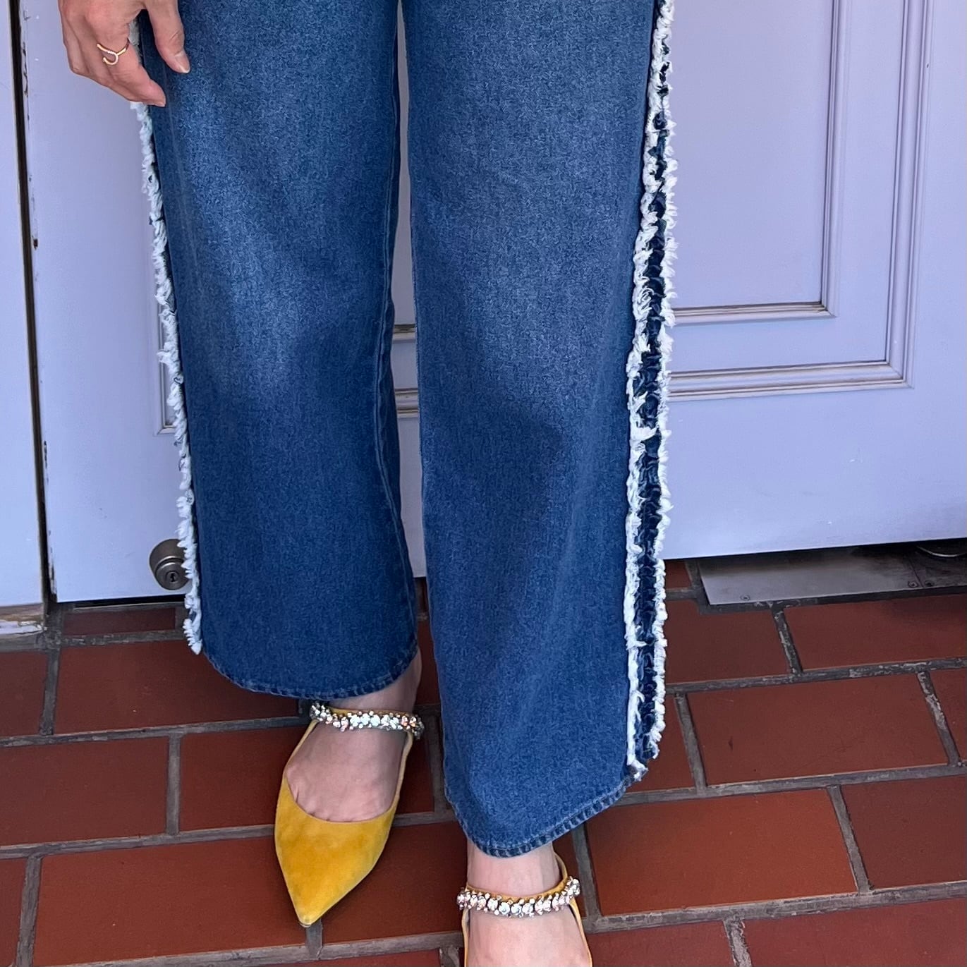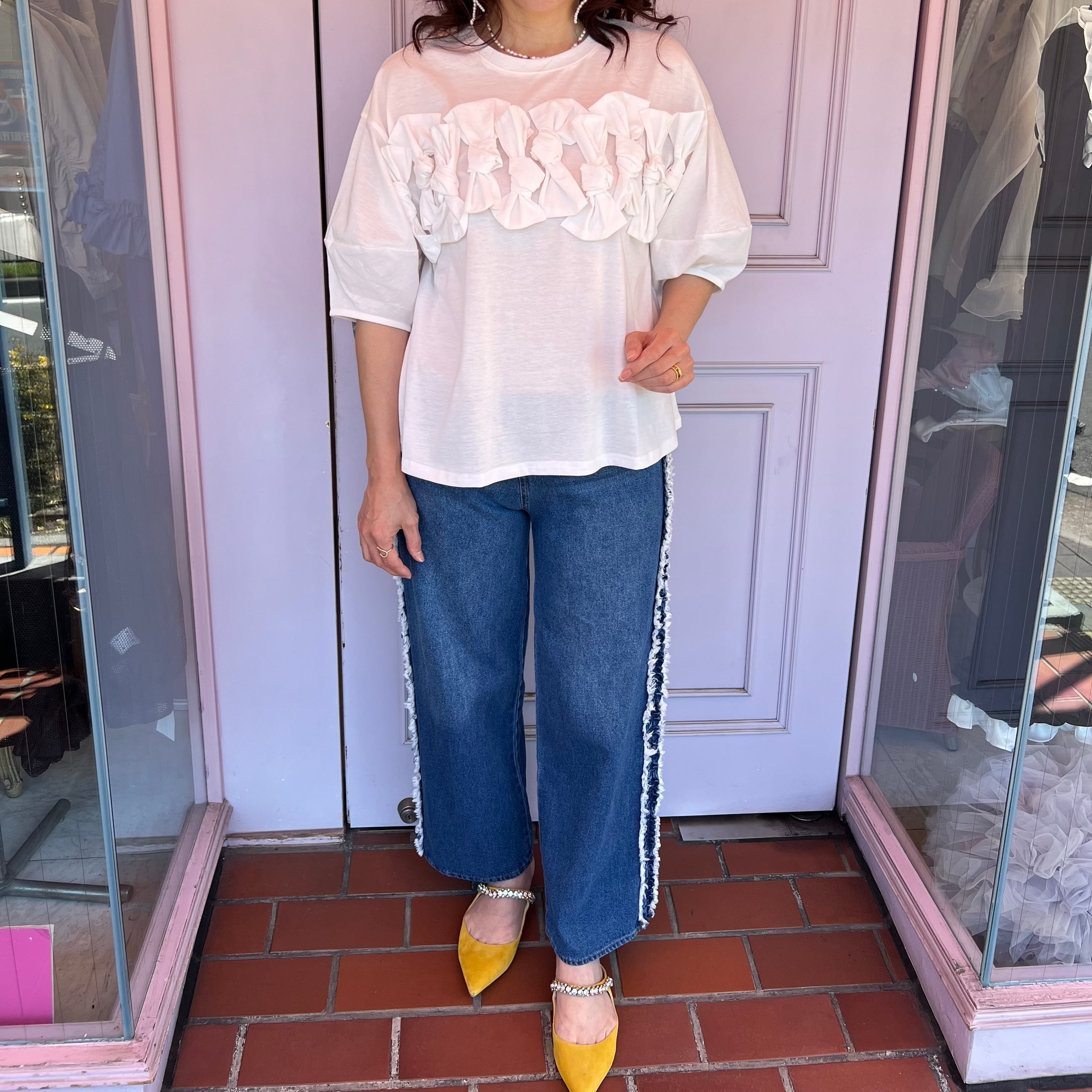 ポケットのパールとサイドのフリルがアクセントになったデニムパンツ。