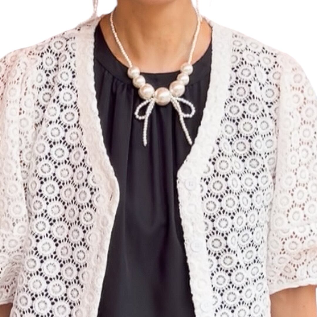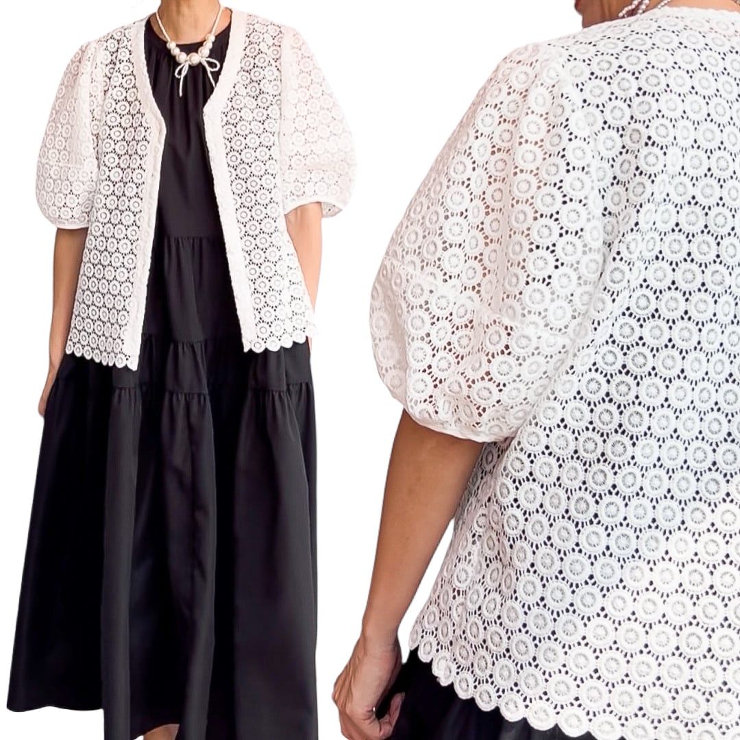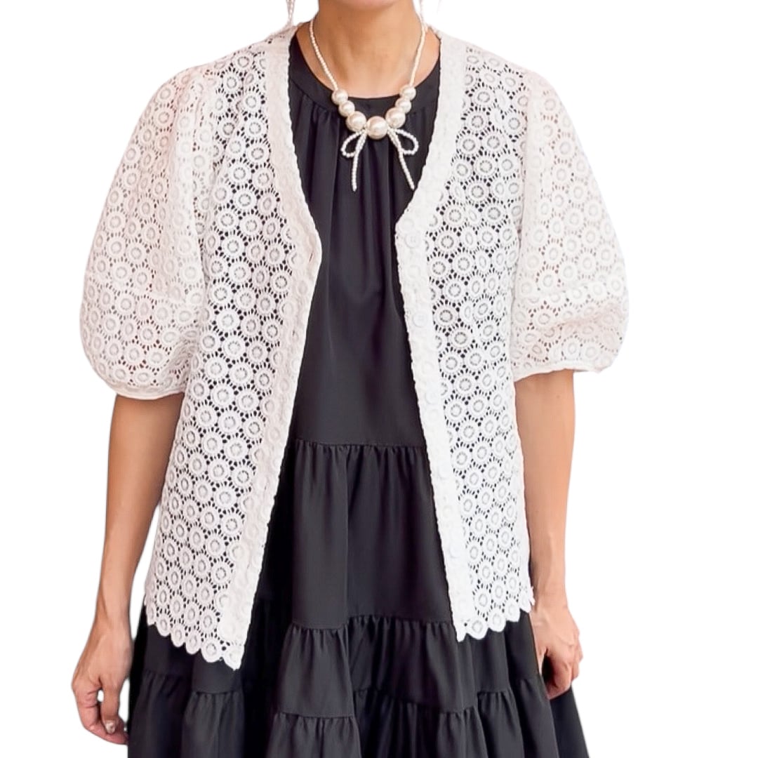 【カーディガン】前ボタンレースお袖ふんわりカーディガン・ホワイト