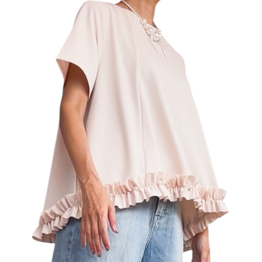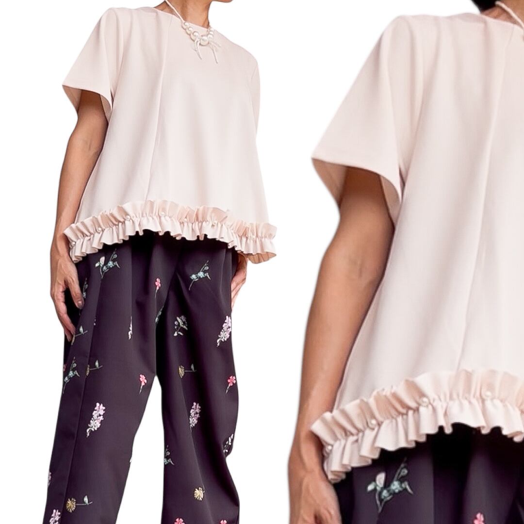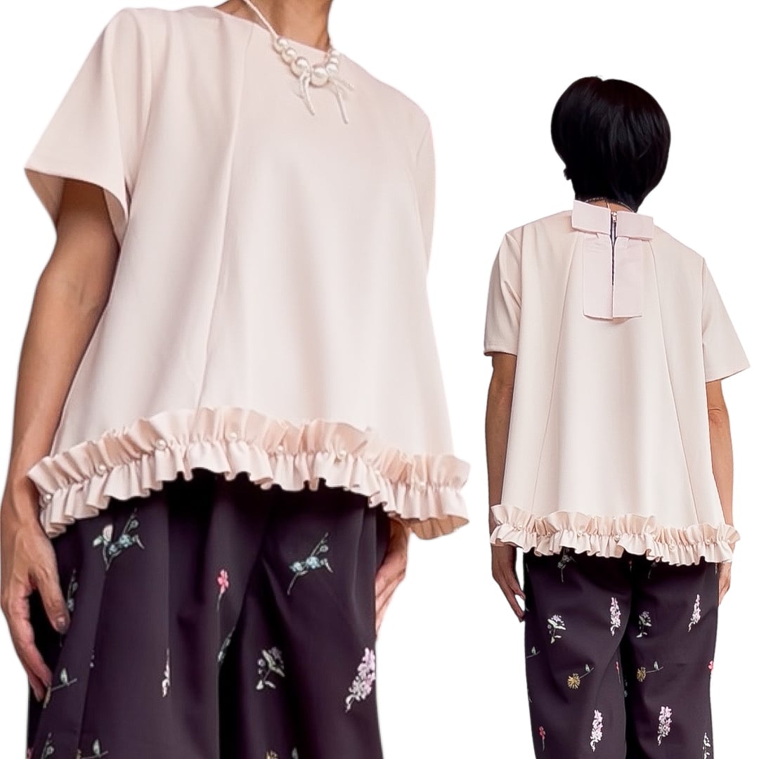 ■後ろリボン裾フリルパール付きトップス・アイボリー