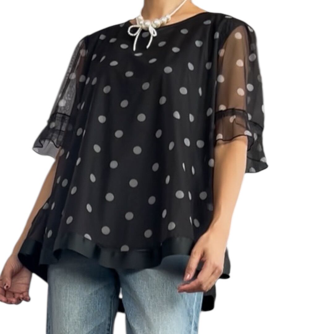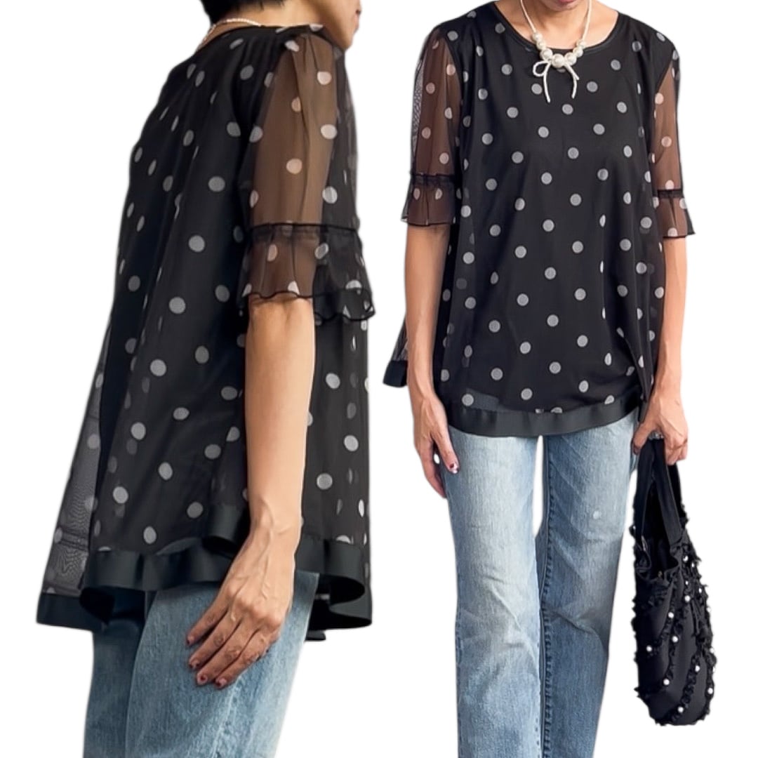 ■シースルードット 裾グログランリボントリミング トップス