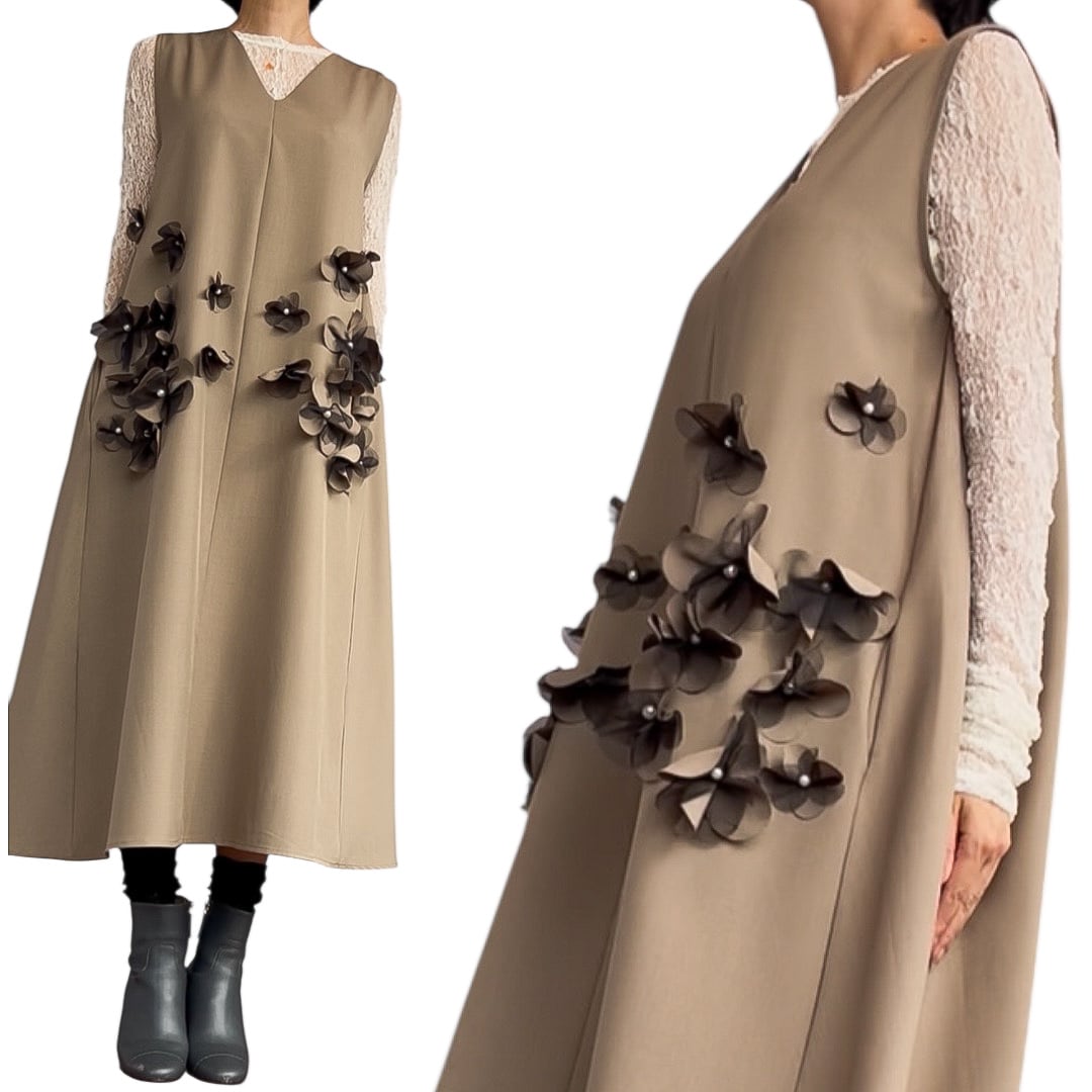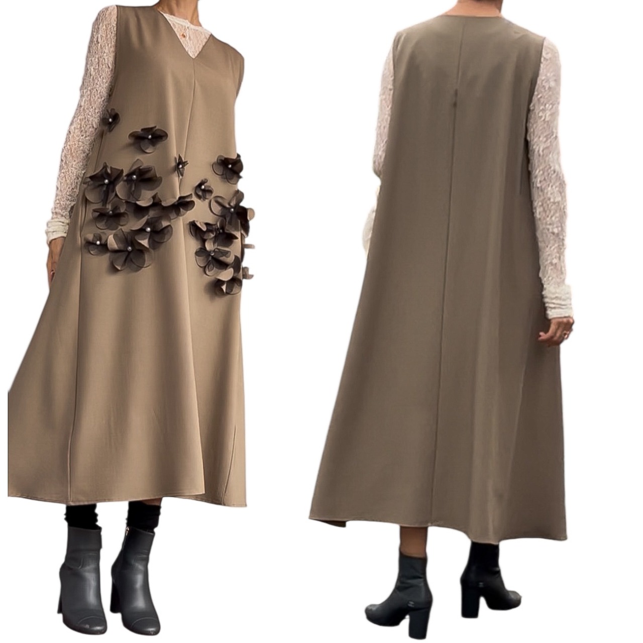 【ワンピース】Vネックフラワーパールワンピース・カーキ