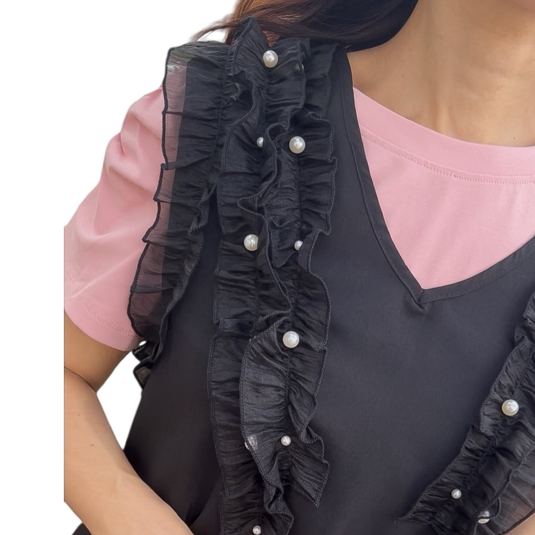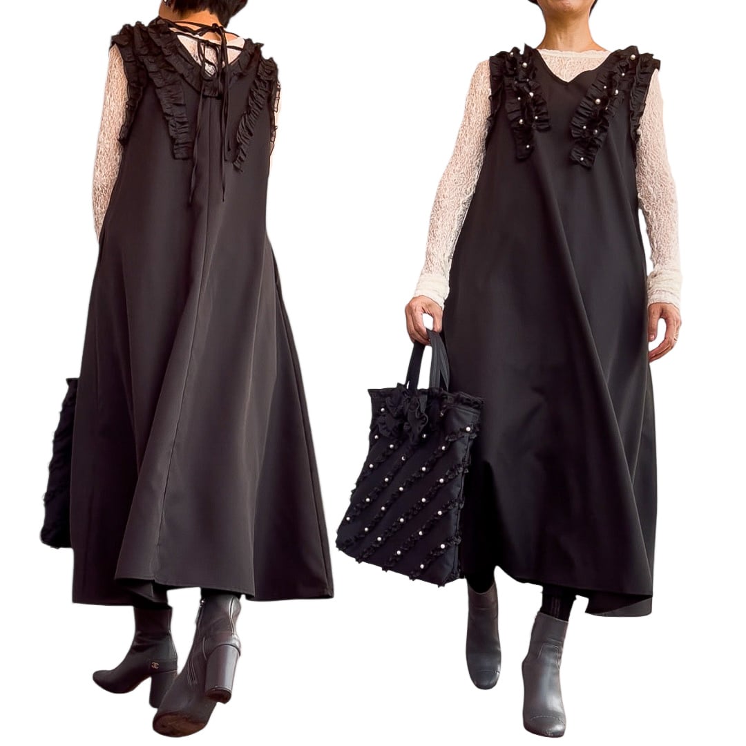 【ワンピース】Aラインフリルパールワンピース・ブラック