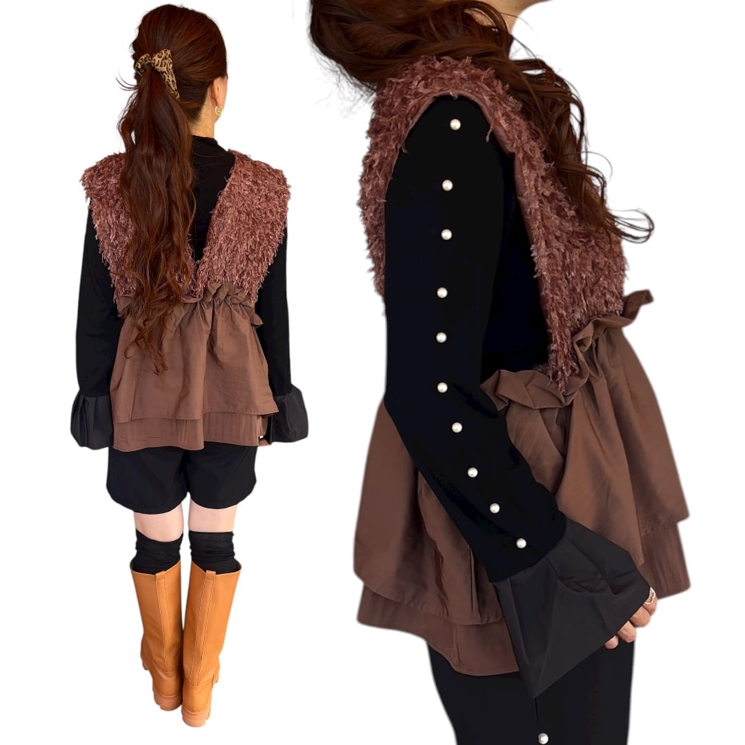 【ベスト】フェイクファー ティアードベスト・ブラウン