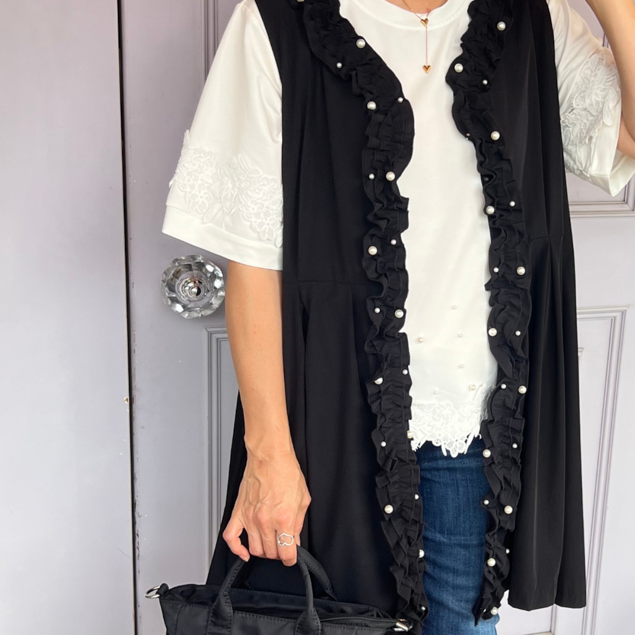 縦フリルとパールがIラインを強調し、着るだけで細見えを叶えるジレ♡