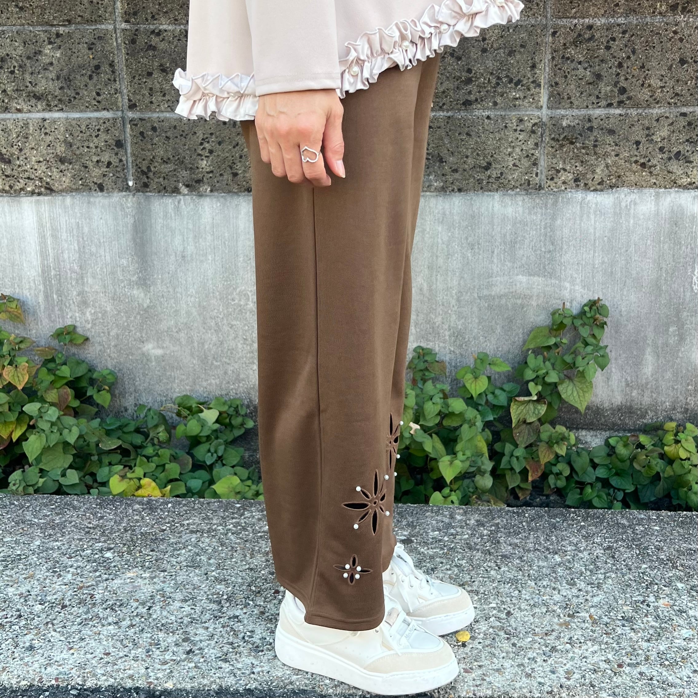 【パンツ】フラワーデザイン ミニパール付きパンツ・ブラウン