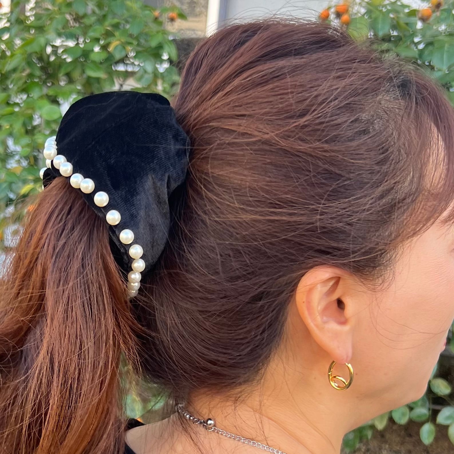 上品な艶を放つベルベット素材に、パールをあしらった華やかシュシュ♡