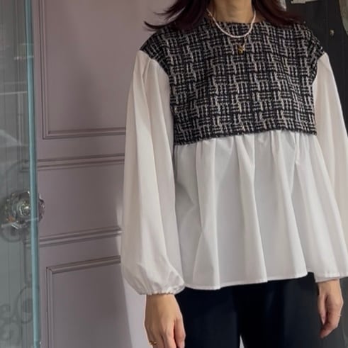 ツイード×シャツ地の異素材ドッキングブラウス♡