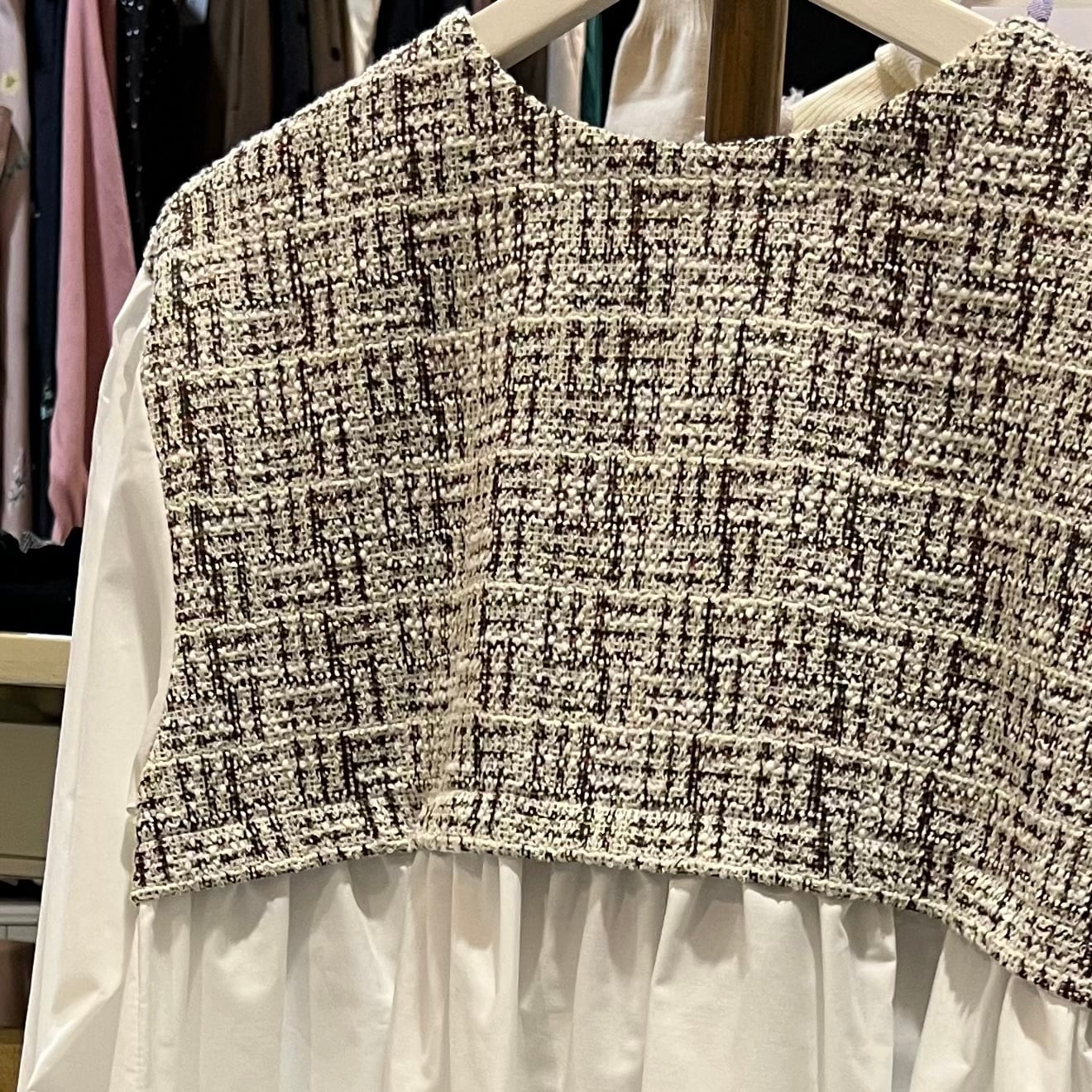 ツイード×シャツ地の異素材ドッキングブラウス♡