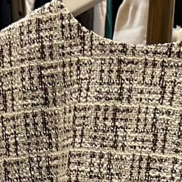 上質ツイードが華やかさを添え、後ろは長め丈で体型カバーも◎