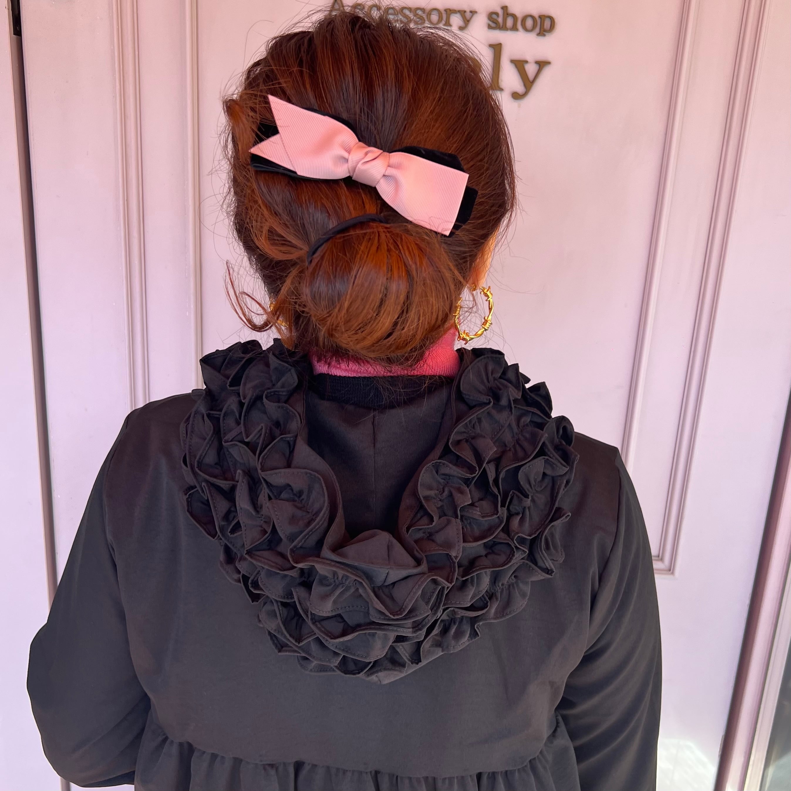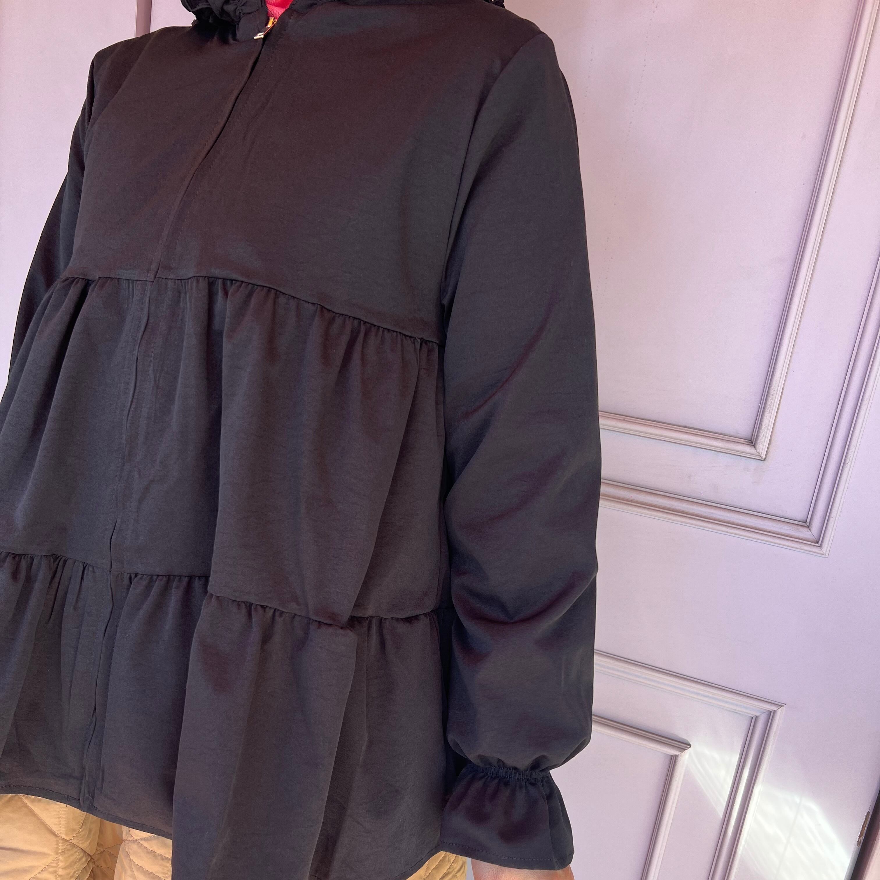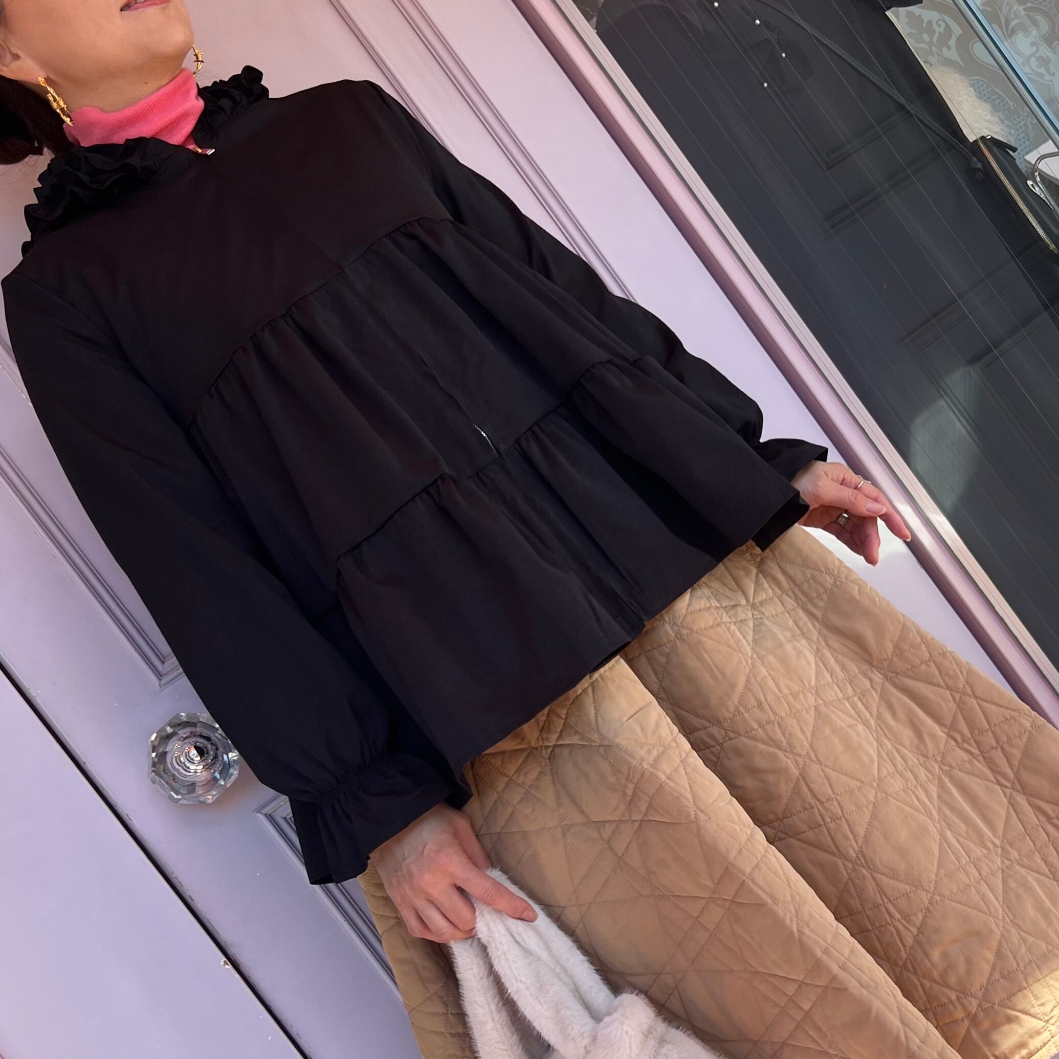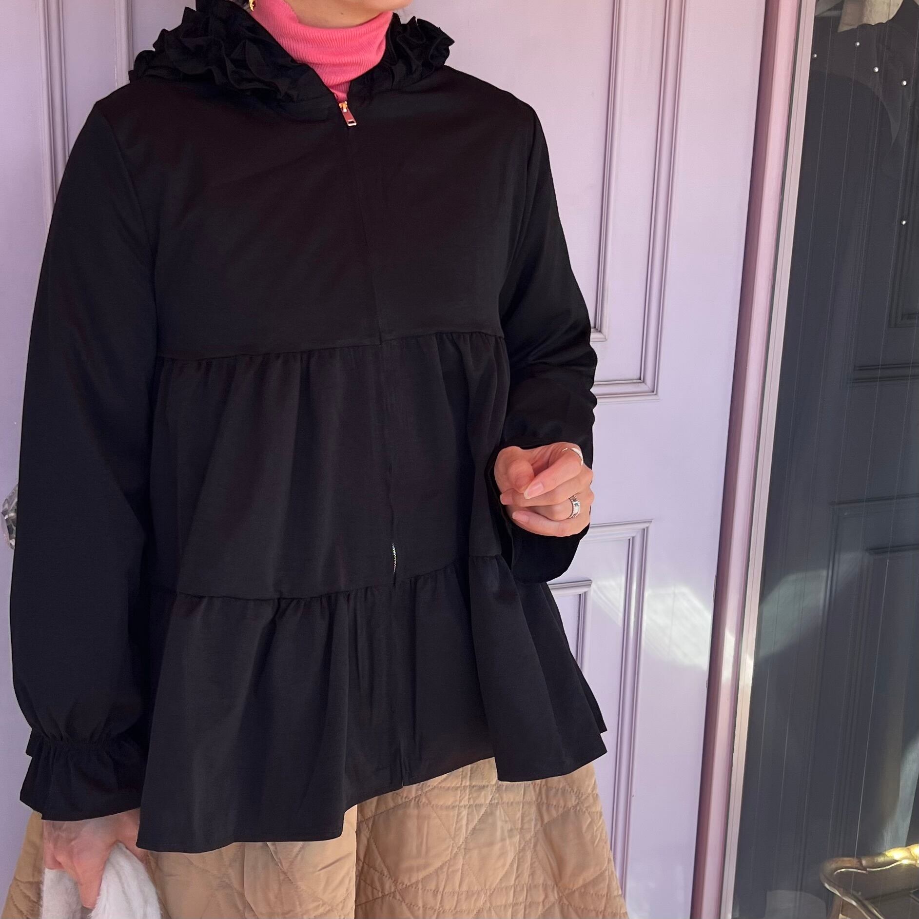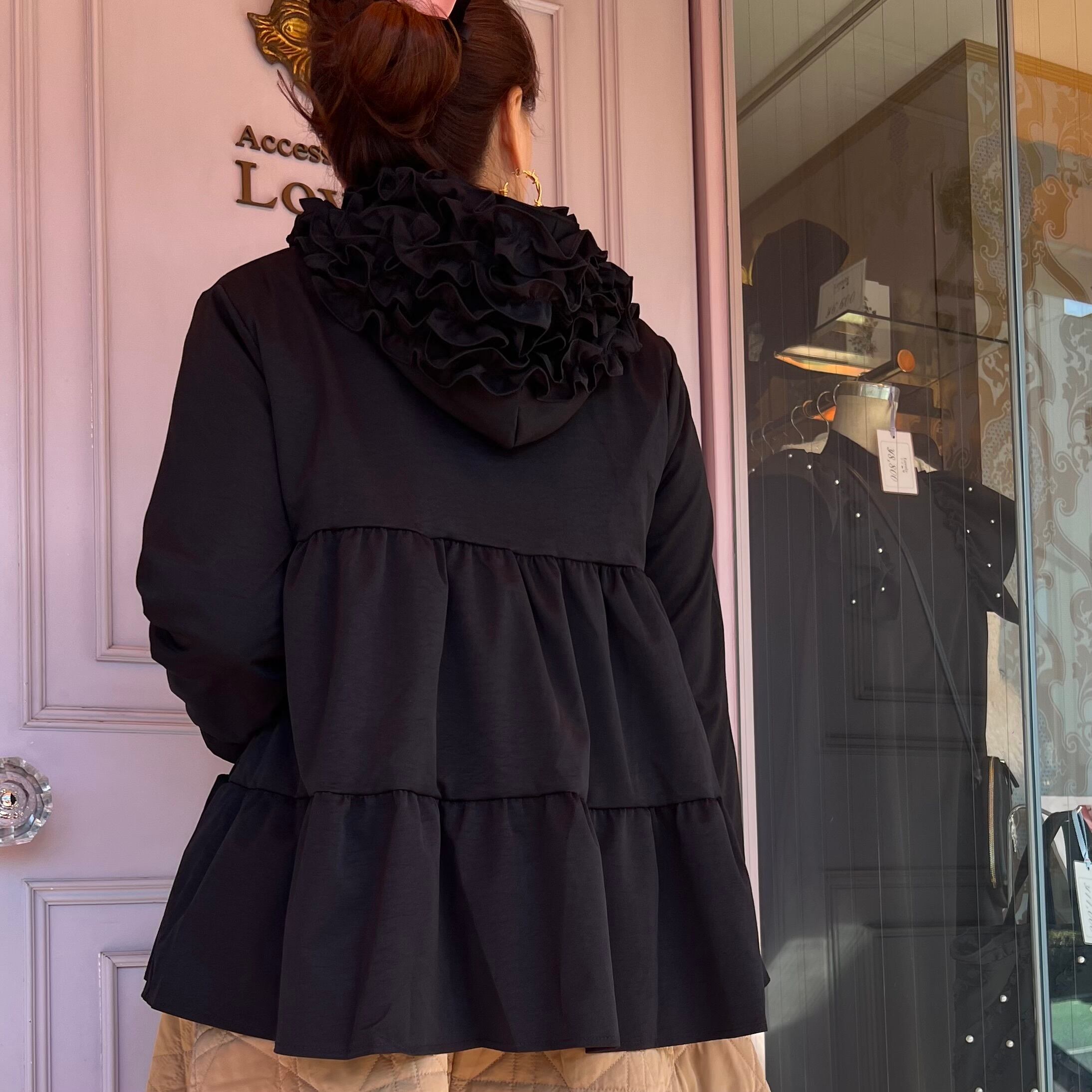 フリルたっぷりのフード&ティアードシルエットが華やかなブラックアウター♡
