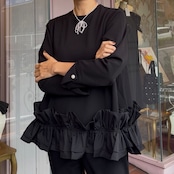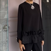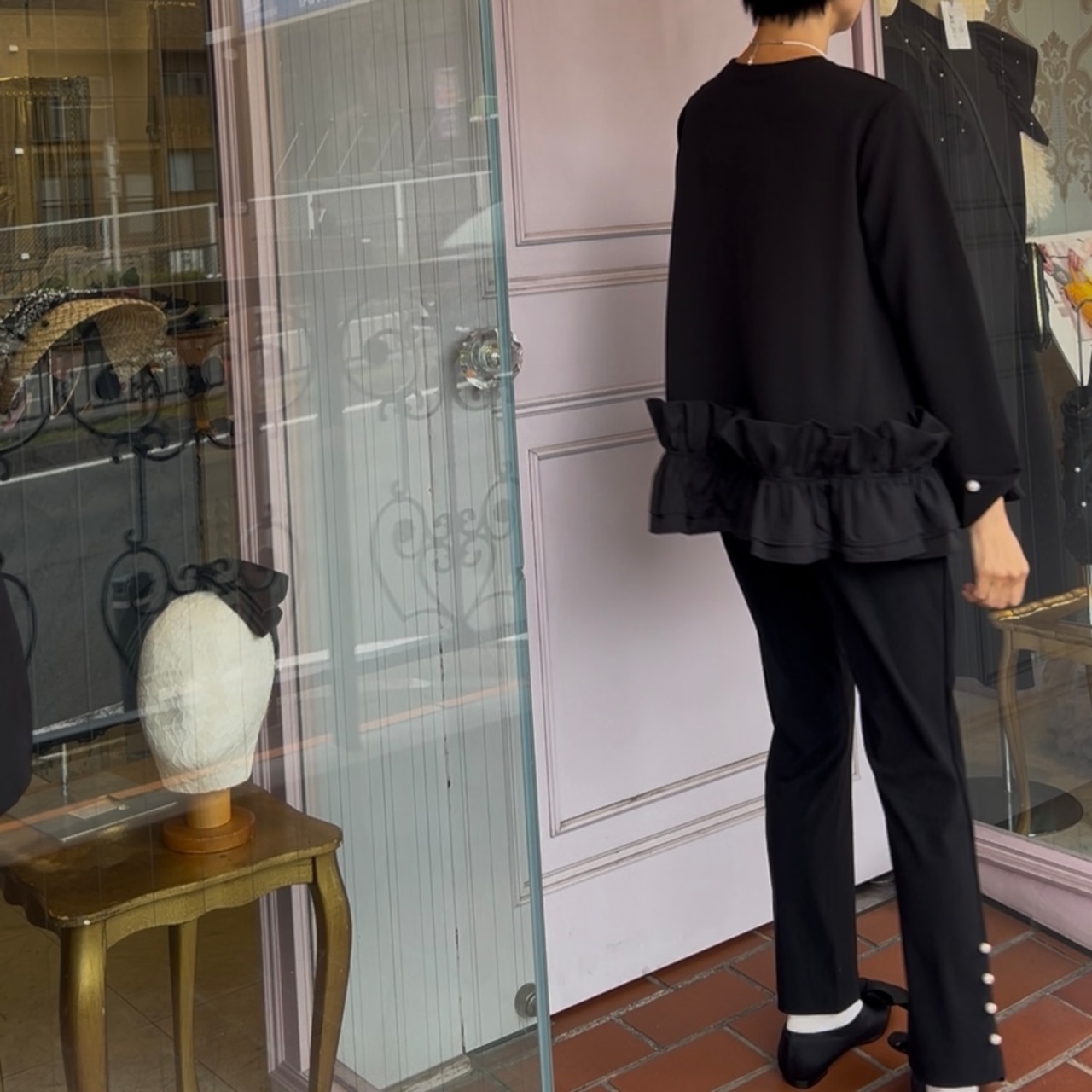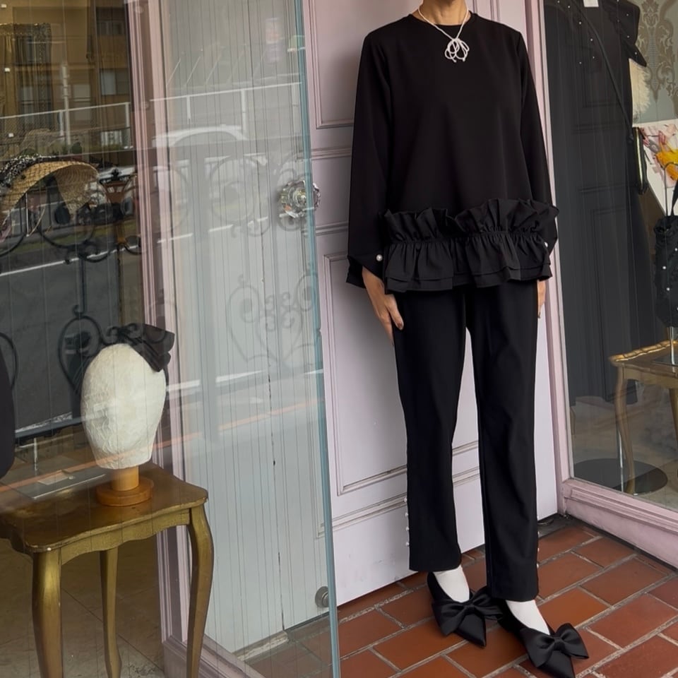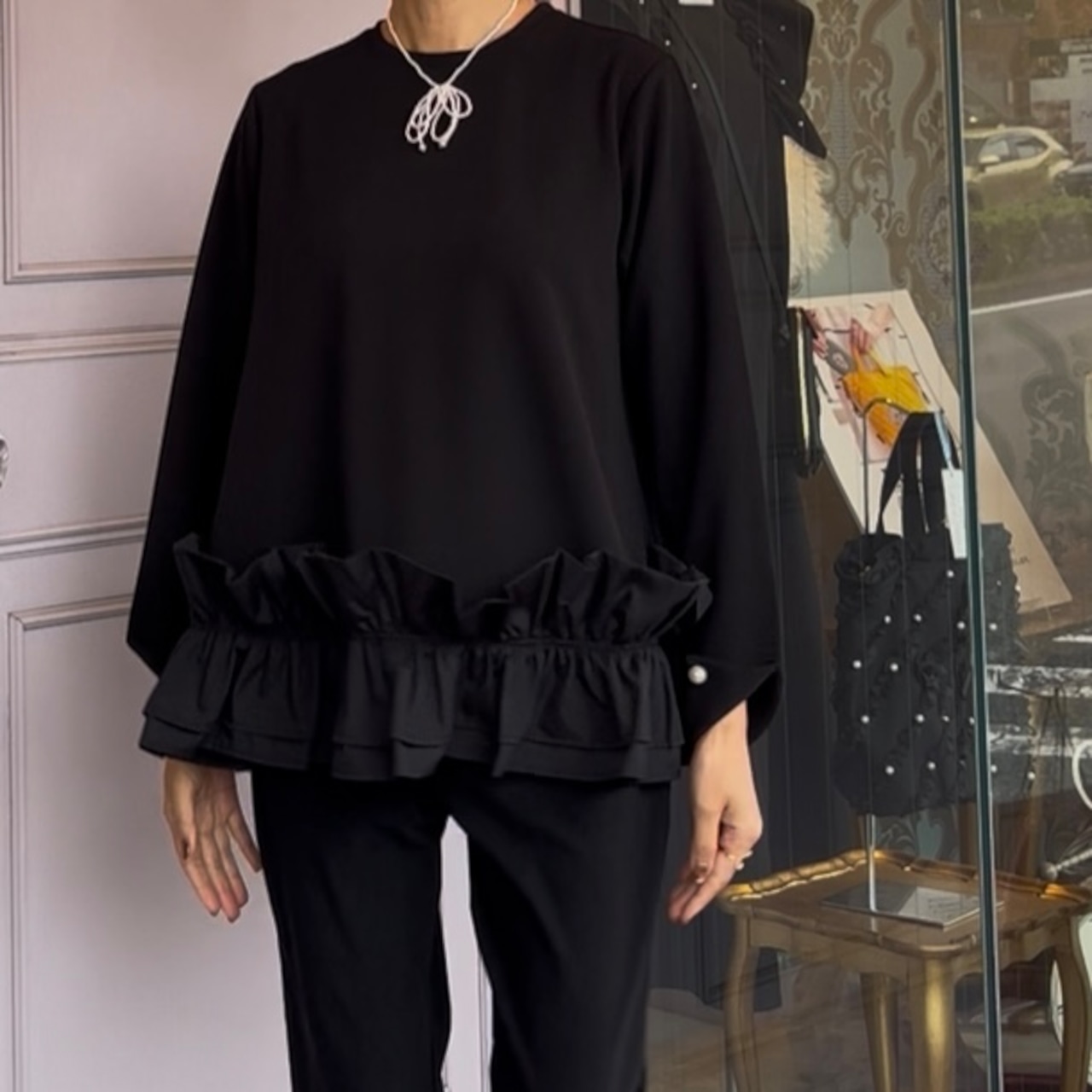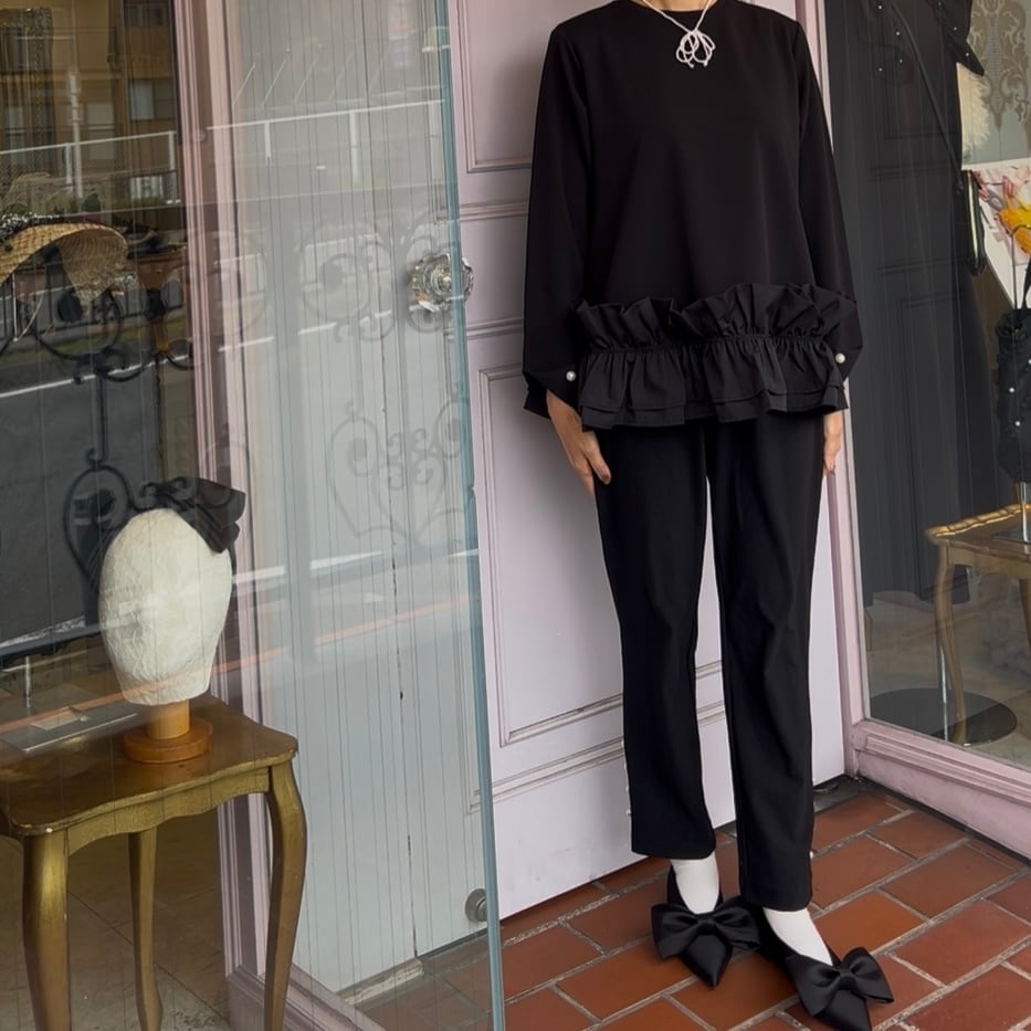 【トップス】裾フリルトップスお袖パール付き・ブラック