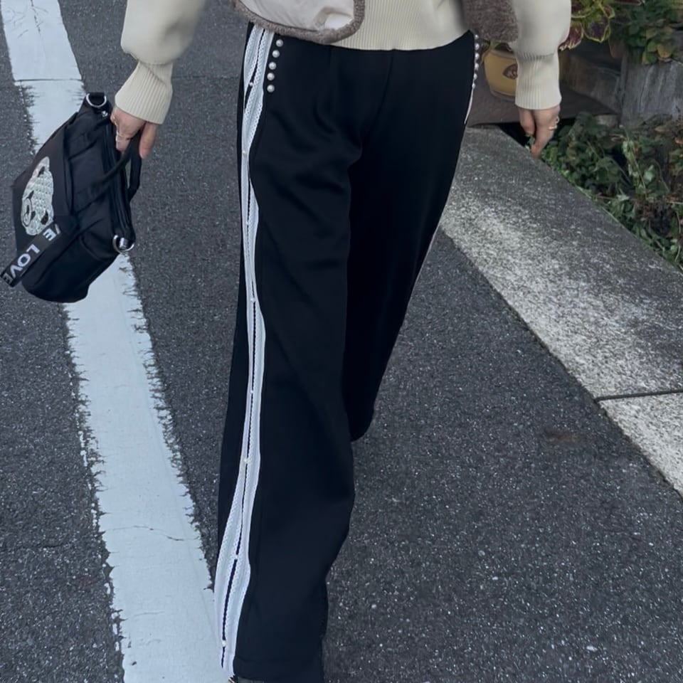 【パンツ】裏起毛サイドレースパール カジュアル パンツ
