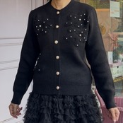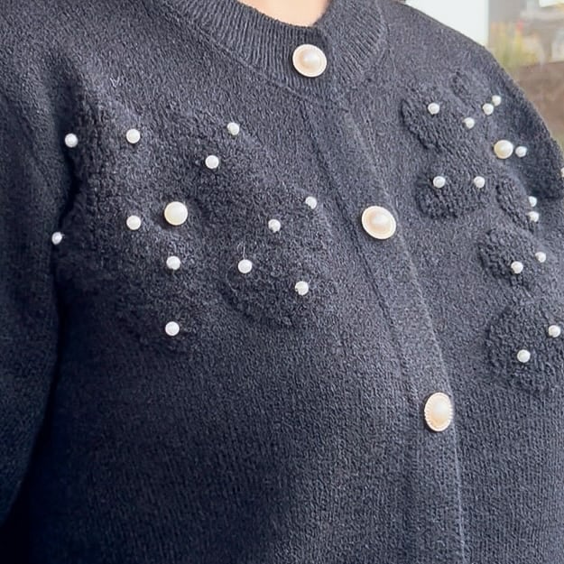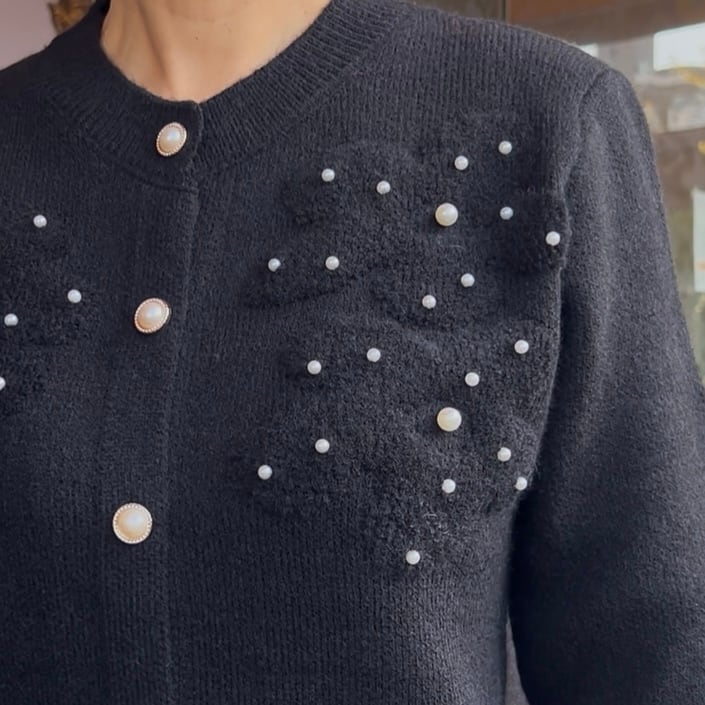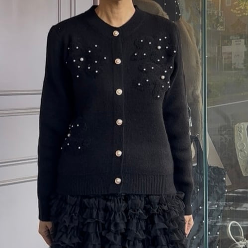 ■ボタンパール ポコポコフラワーカーディガン・ブラック