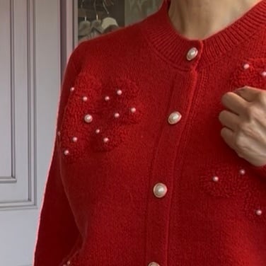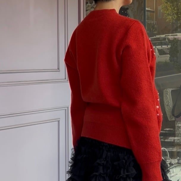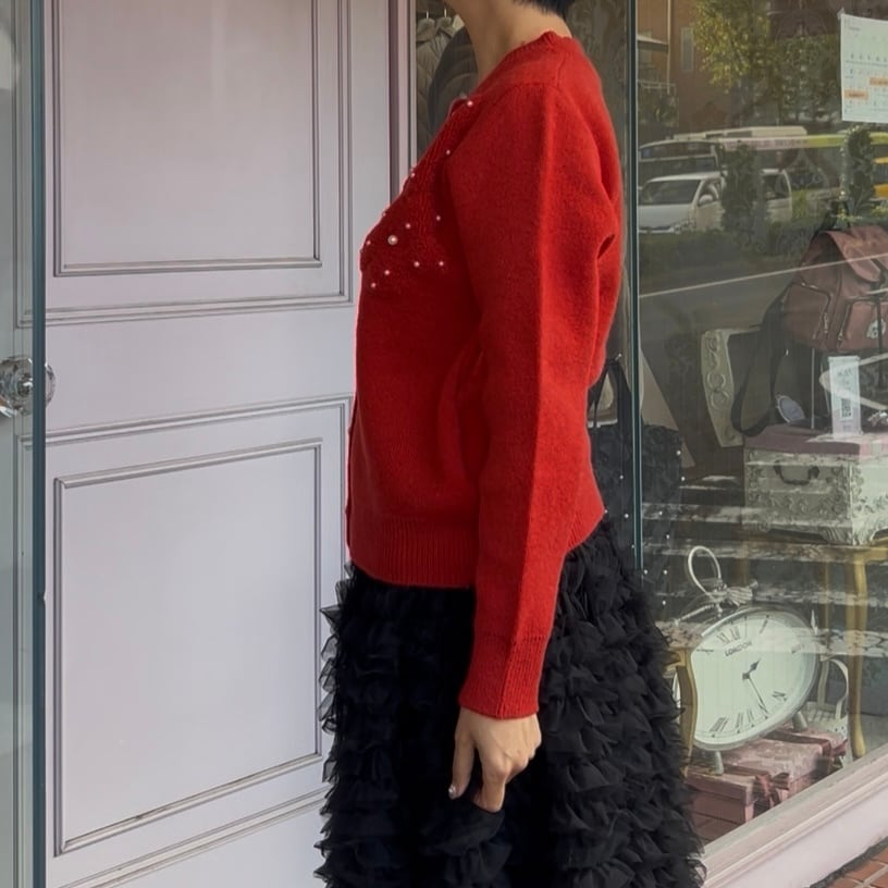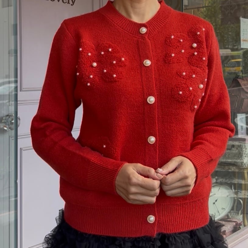 ■ボタンパール ポコポコフラワーカーディガン・レッド