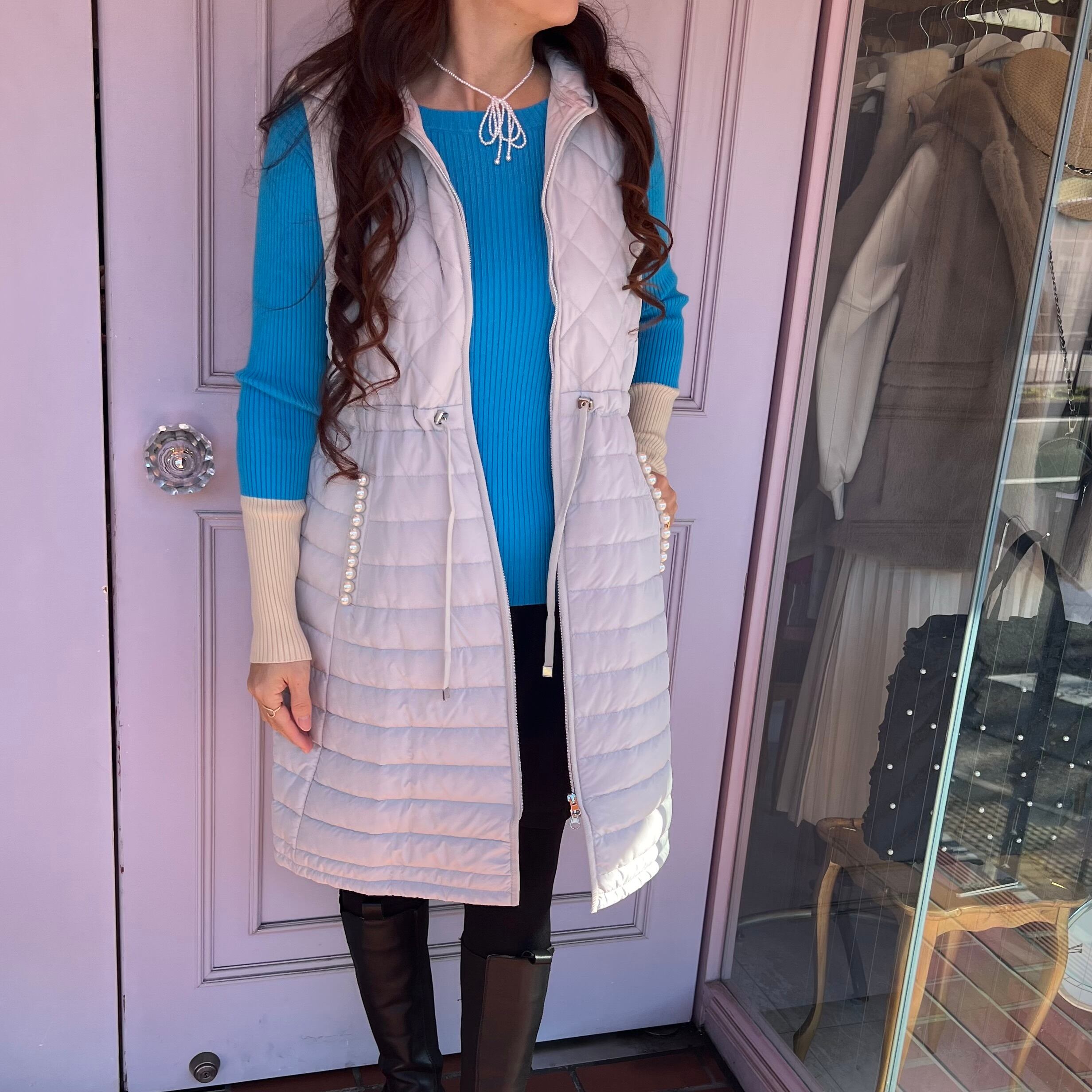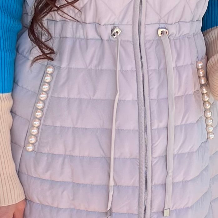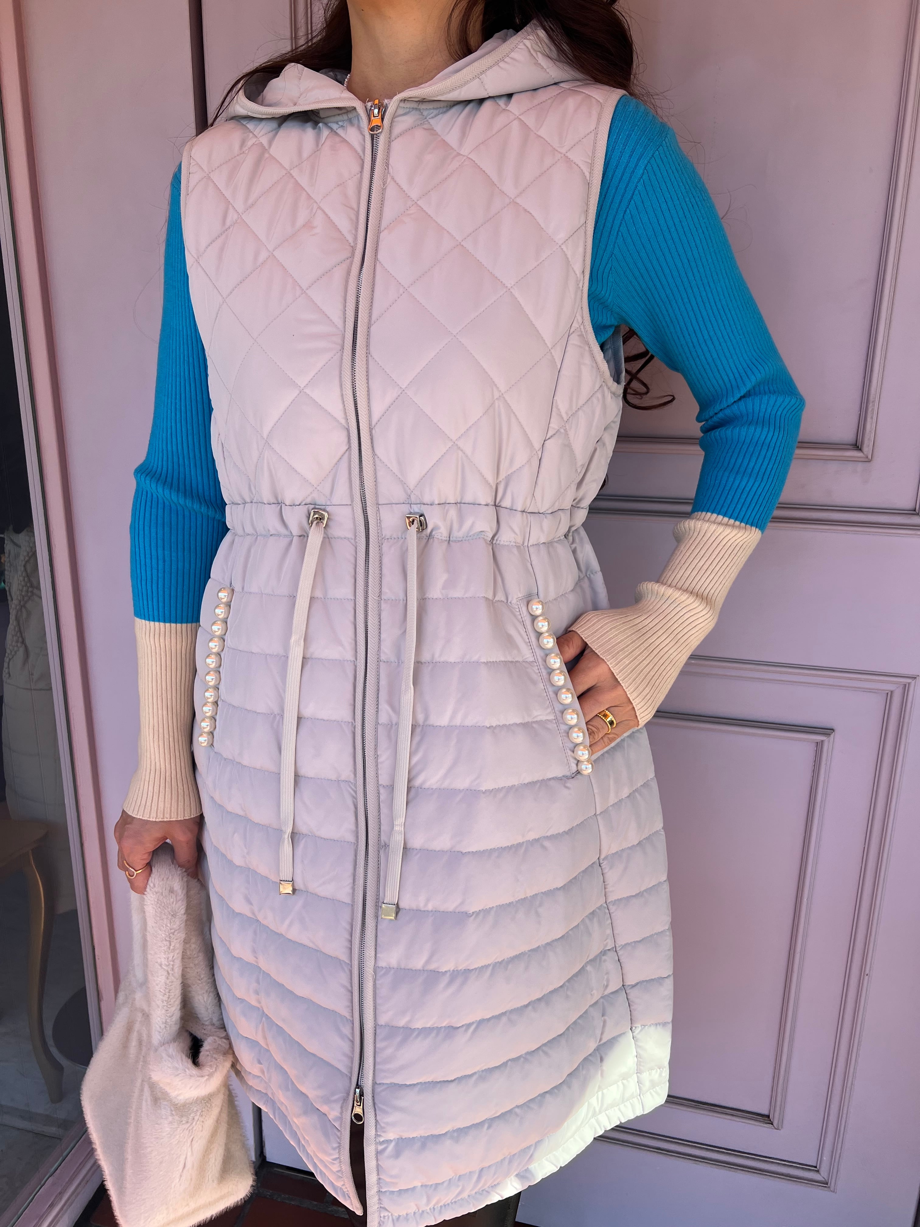【再入荷】エレガンスキルティング フード付きジレ・ライトグレー