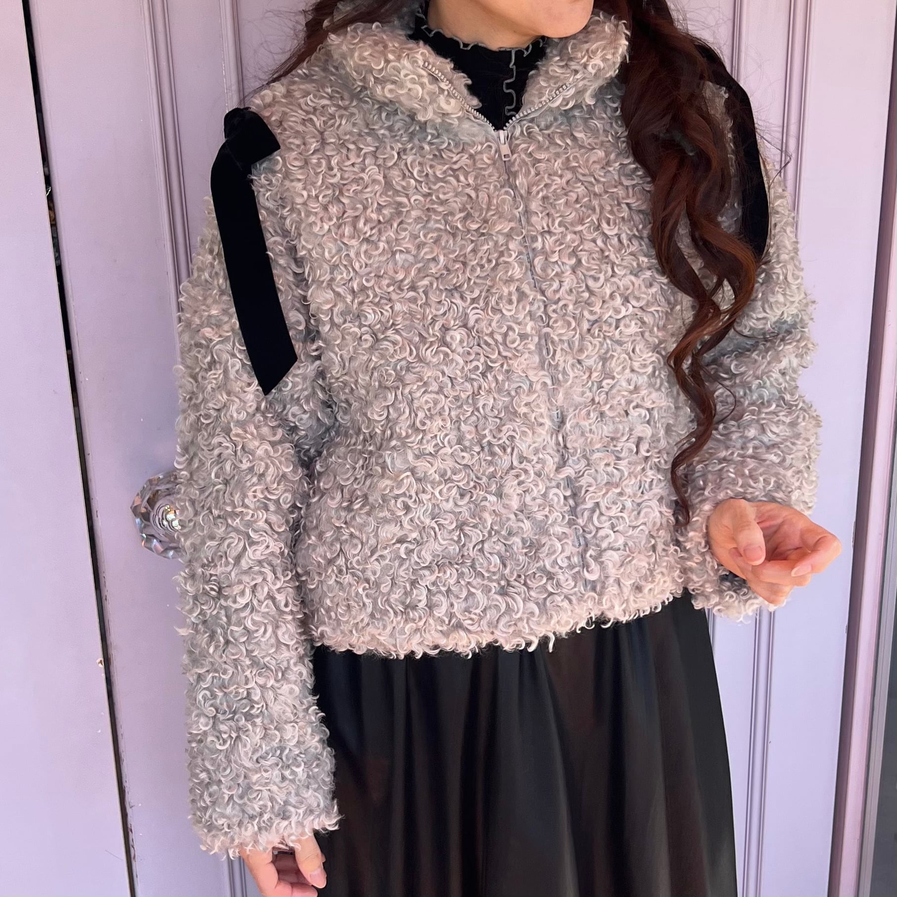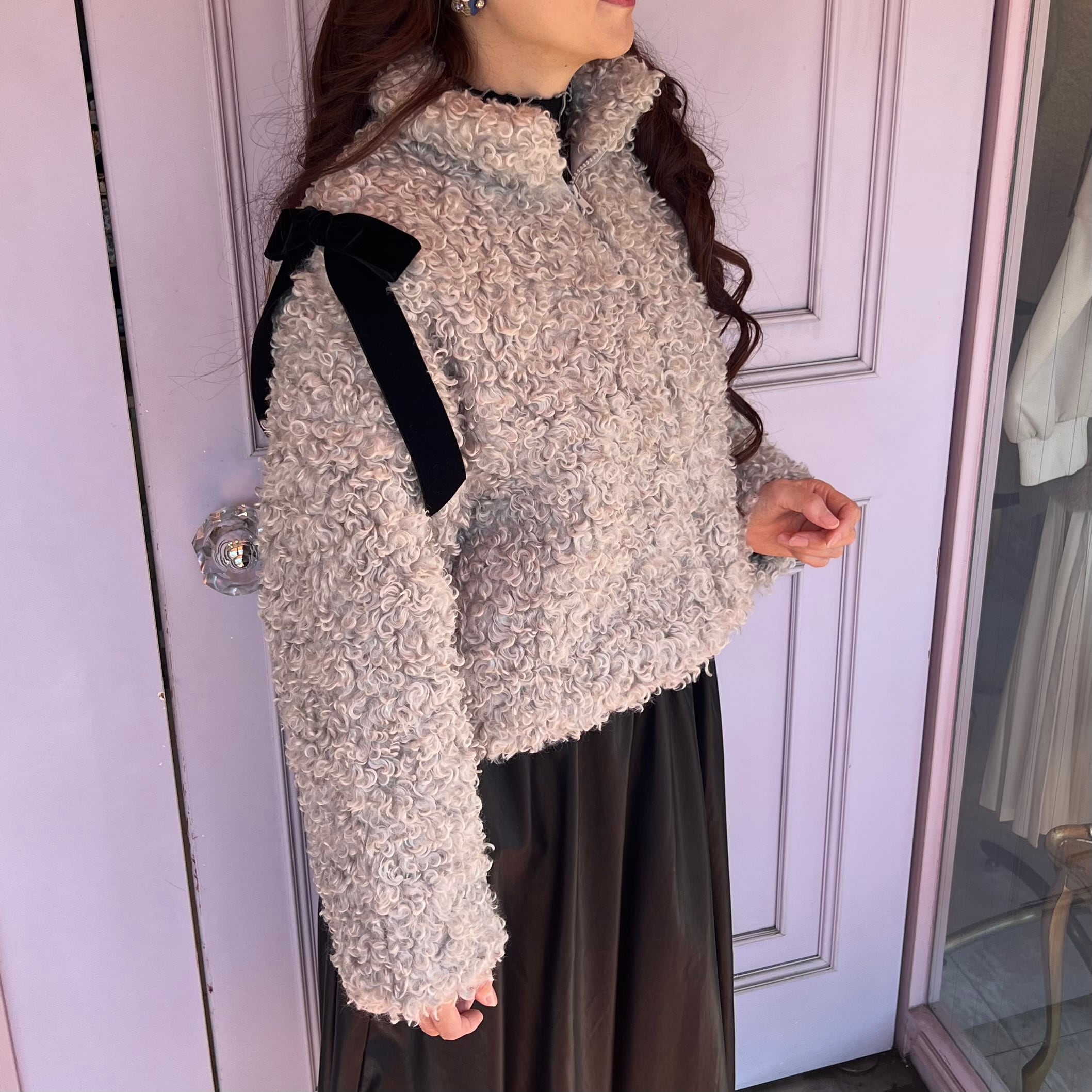 ■リボン付きプードルファーアウターグレージュ