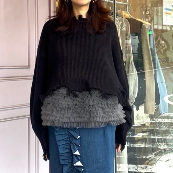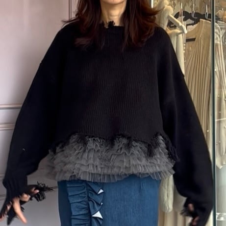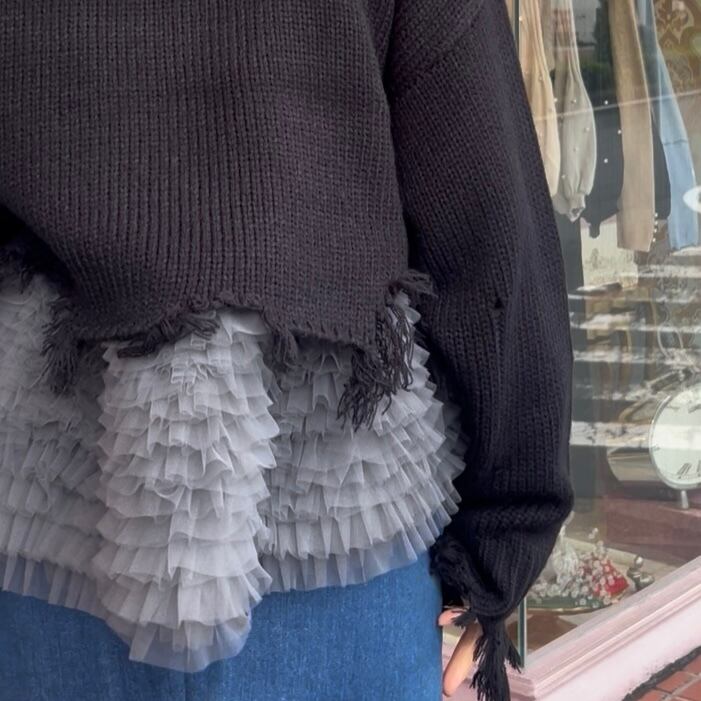 裾にチュールをあしらった、レイヤード風デザインのセーター。