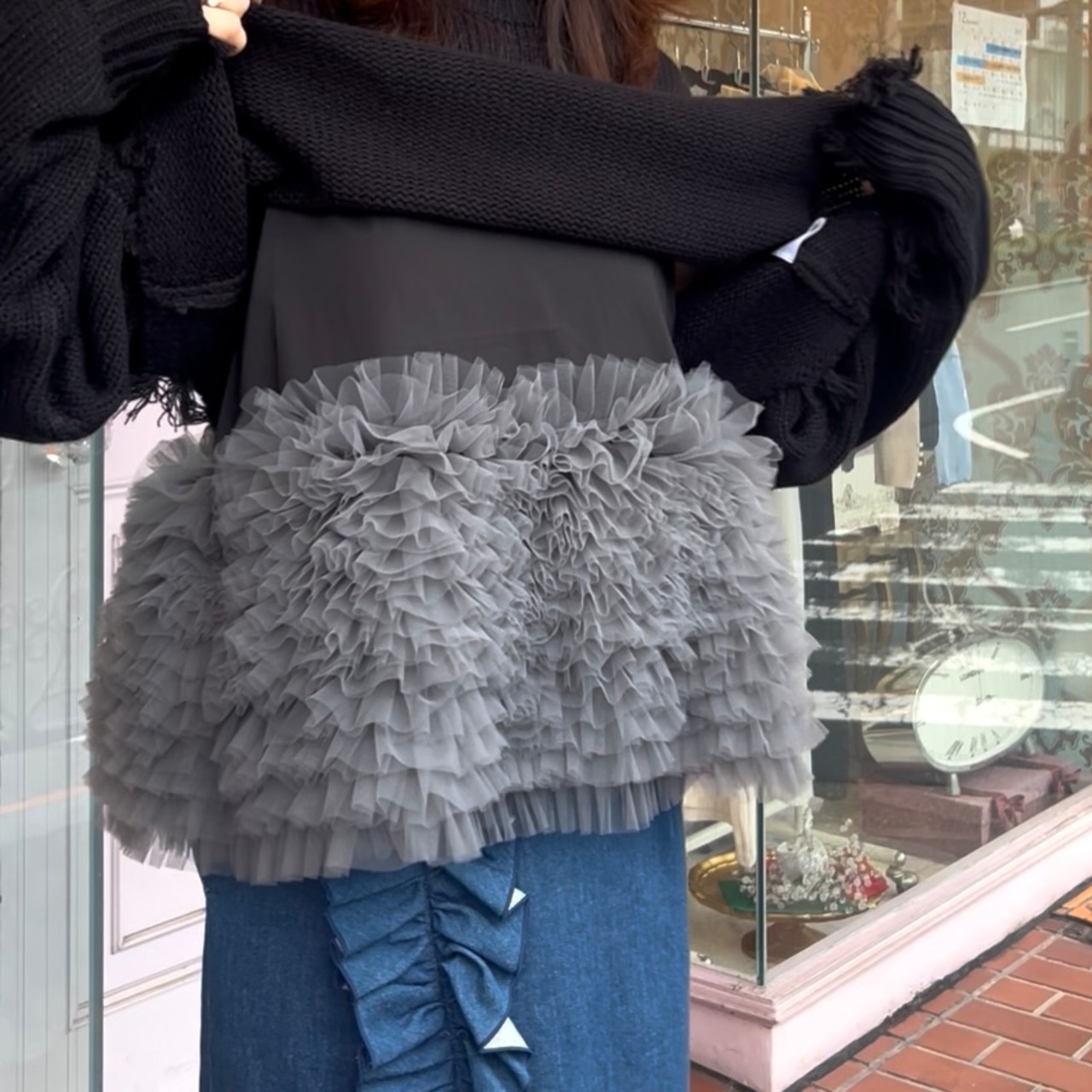 ふんわりと揺れるチュールが、いつものセーターコーデを