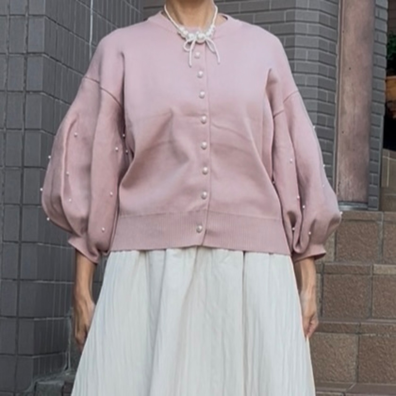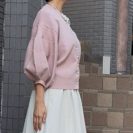 ■お袖ポワンボタンパールカーディガントップス・ピンク