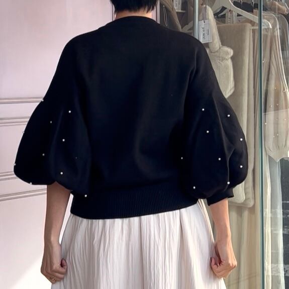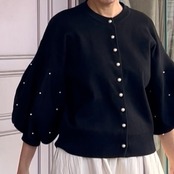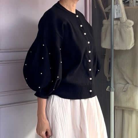 ■お袖ポワンボタンパールカーディガントップス・ブラック