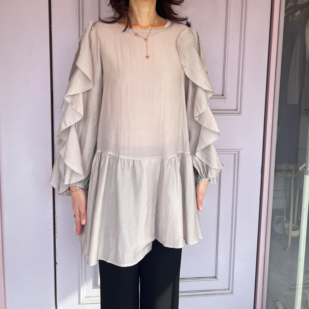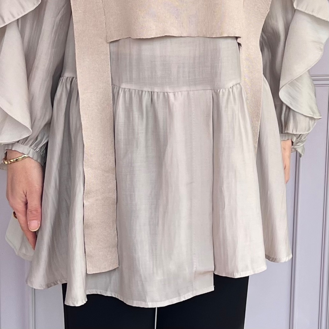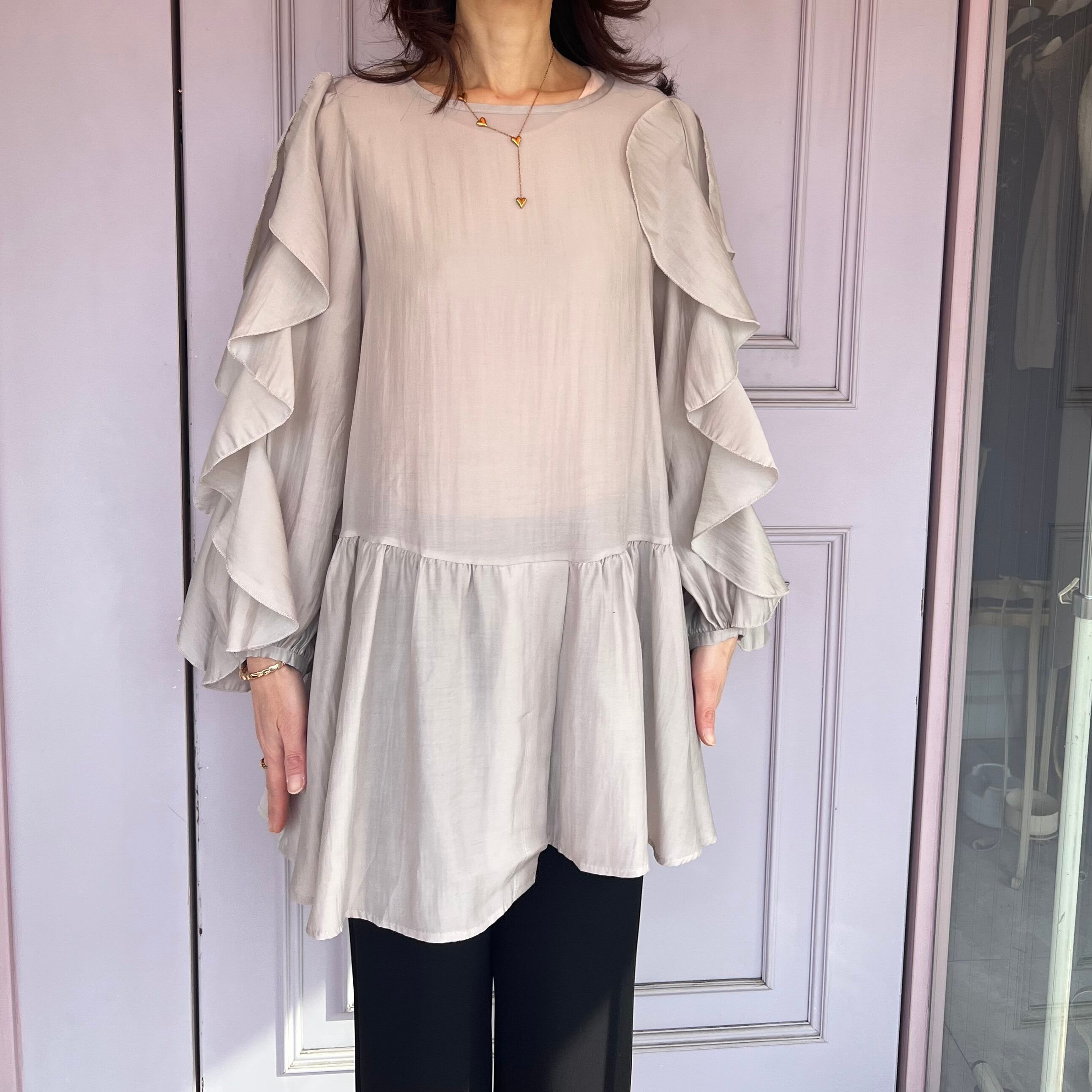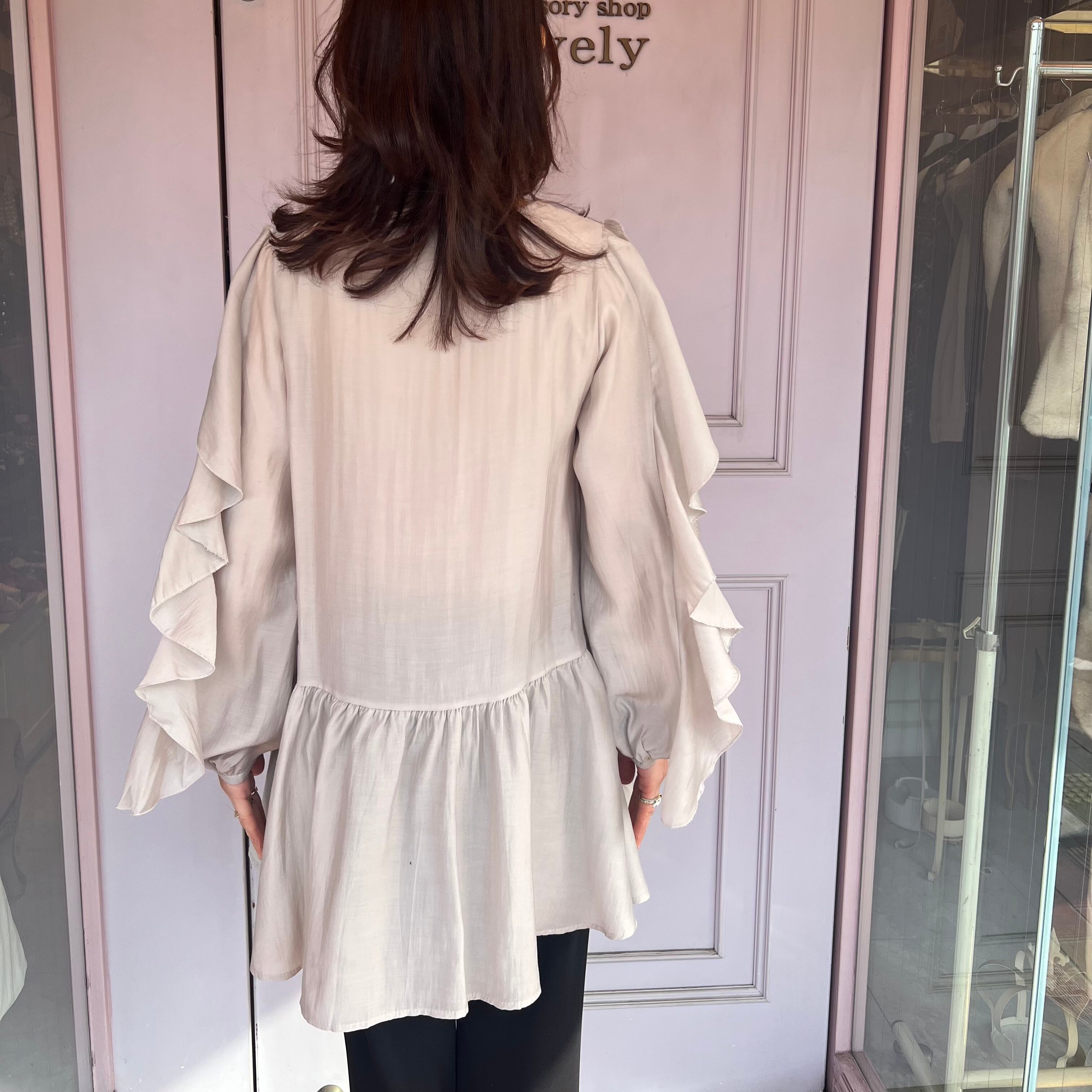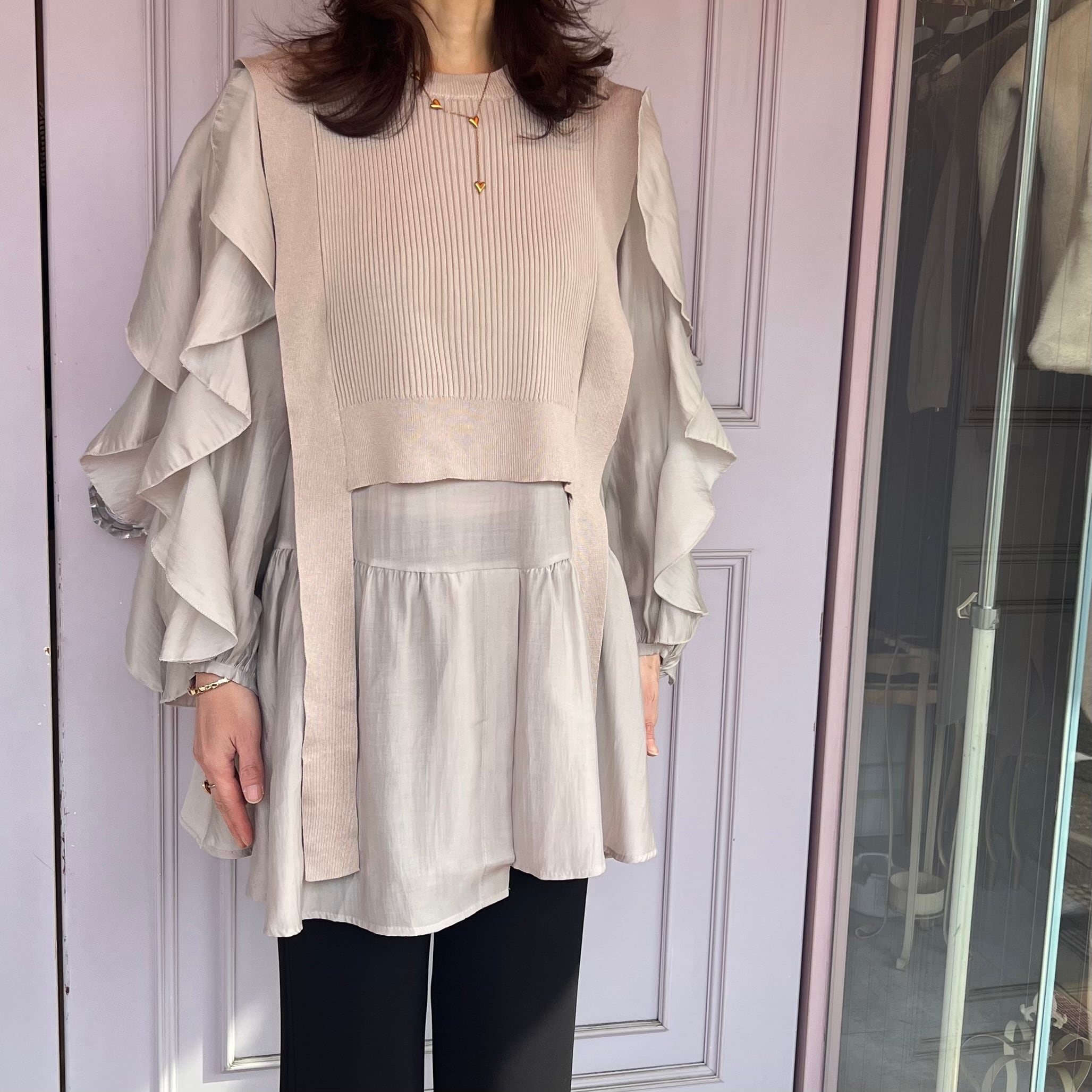 ■腕フリルシャツ ベストセットアップ・ベージュ