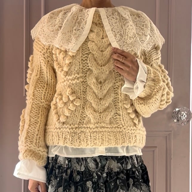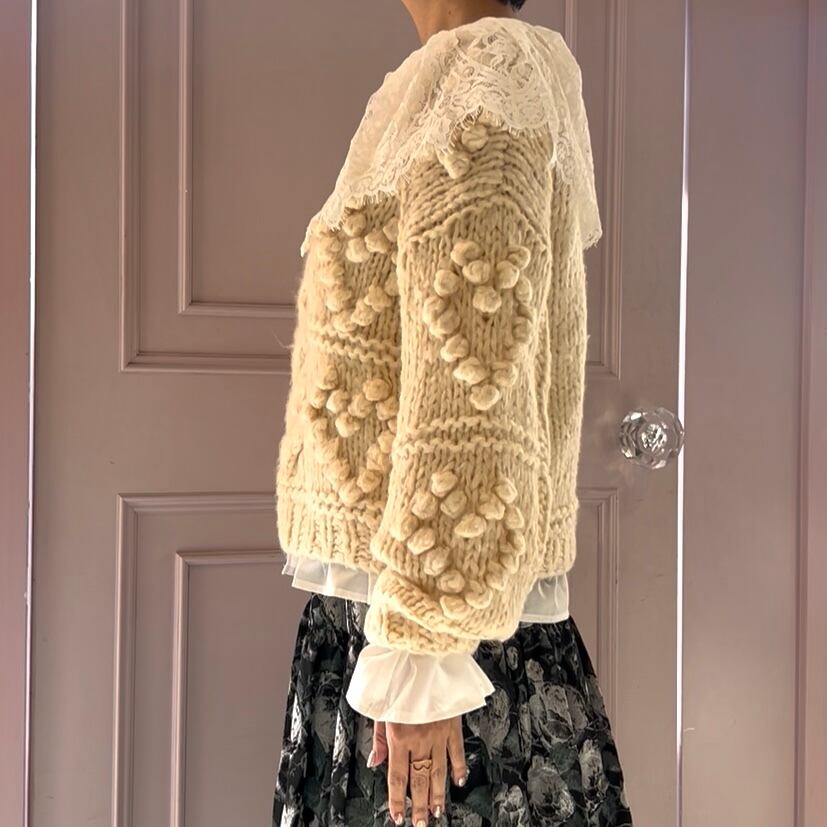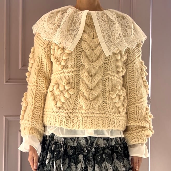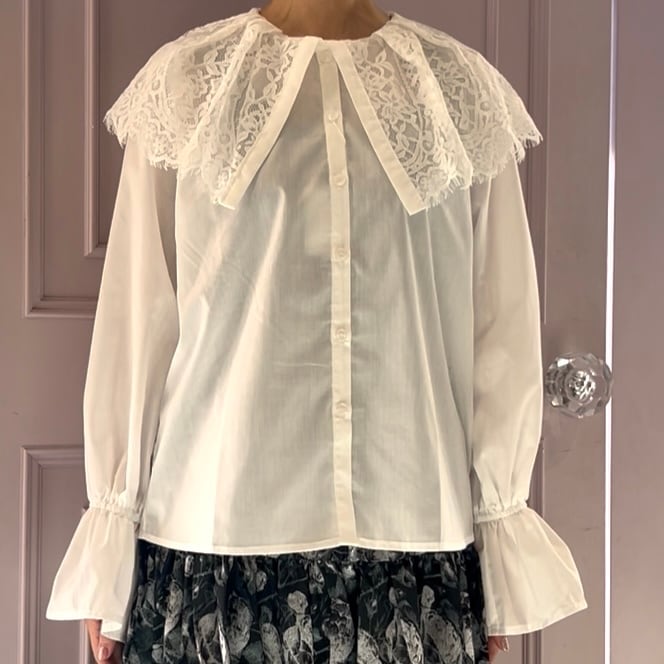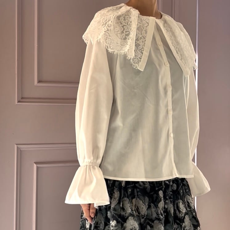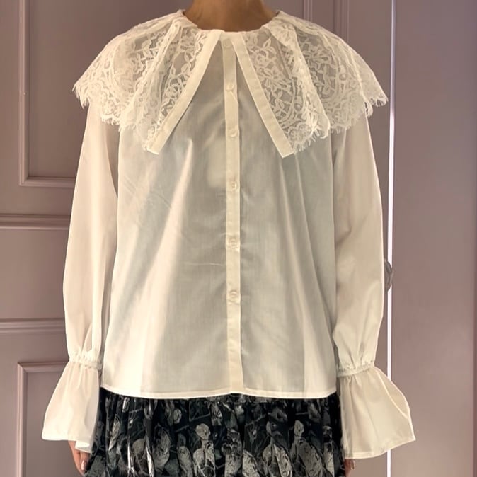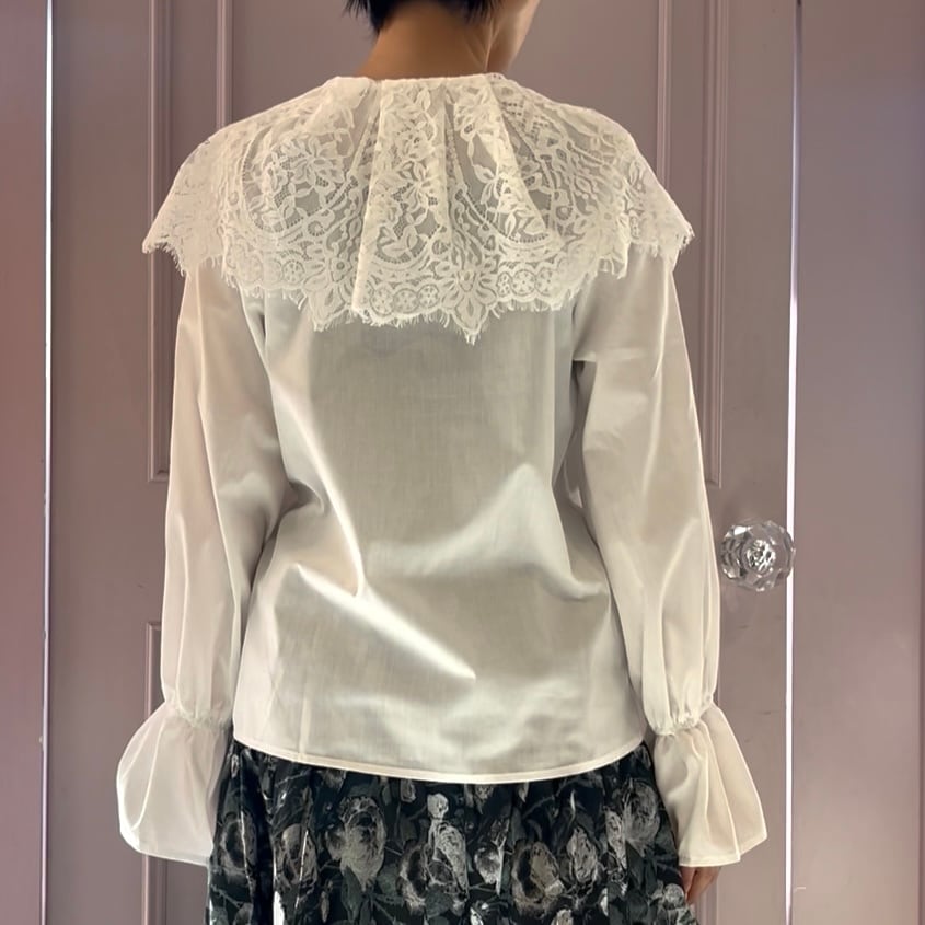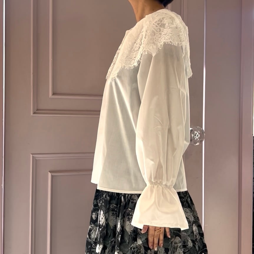 顔まわりを華やかに彩るビッグレース襟が印象的なホワイトシャツ。繊細なレースが甘さを添えながら、すっきりとしたシルエットで大人可愛いバランスに。ふんわりとした袖デザインもポイントです。一枚ではもちろん、ベストやジャンスカとのレイヤードにも映える主役級ブラウスです。