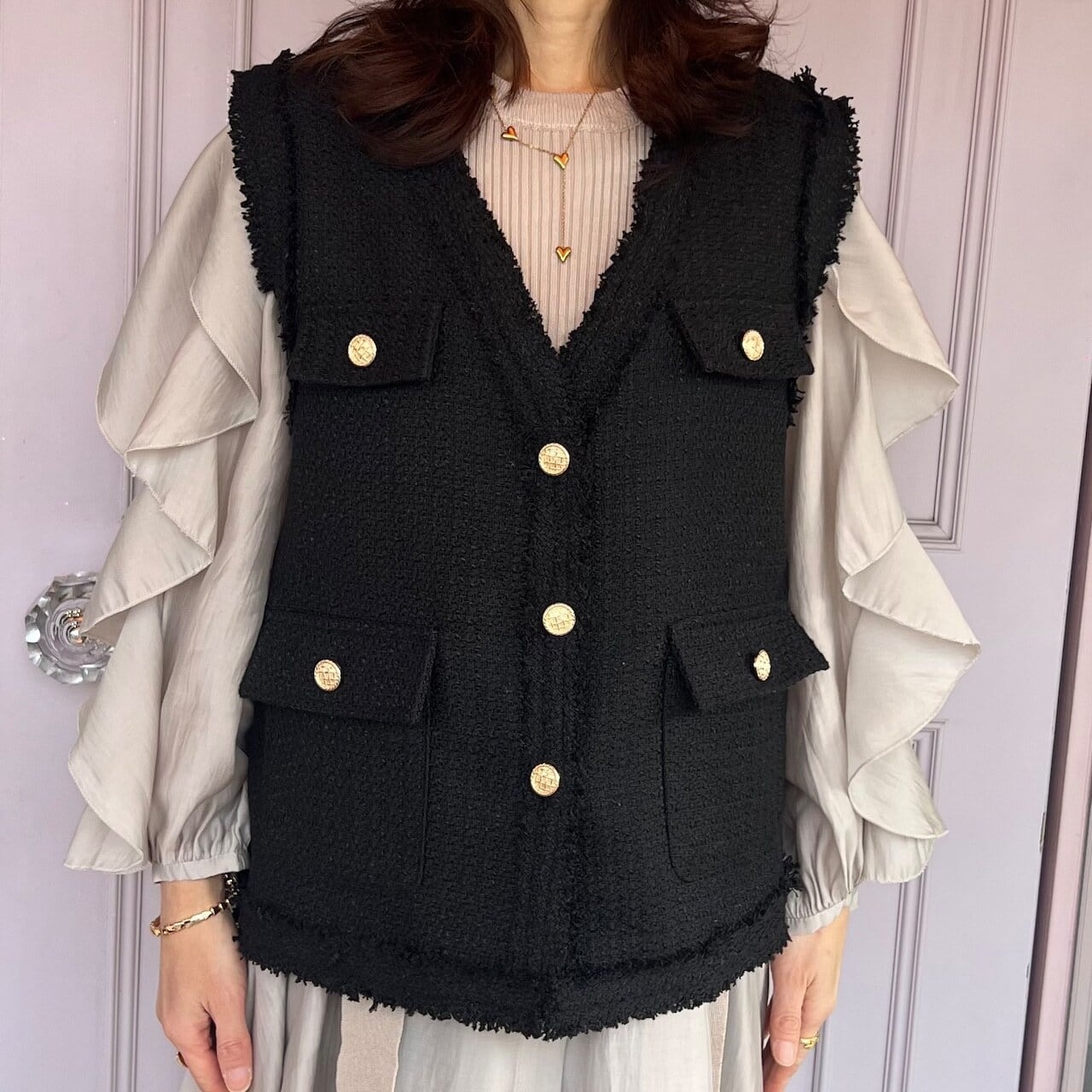 【アウター】フリンジ ツイード ベスト・ブラック ¥12,100