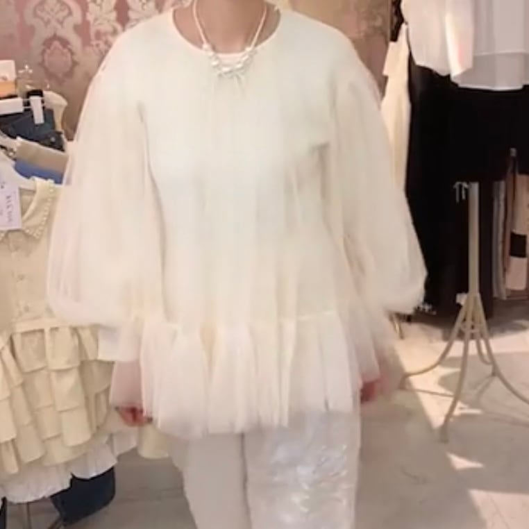 お袖ポワンボタンパールカーディガントップス・ブラック ¥9.900 チュールセーター・ホワイト ¥15,400
