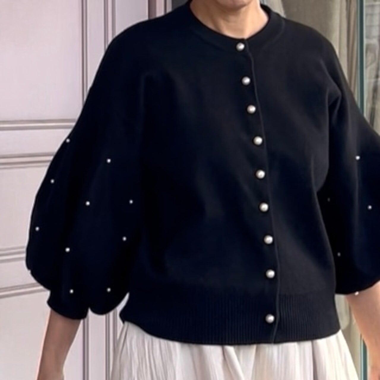 【カーディガン】お袖ポワンボタンパールカーディガントップス・ブラック ¥9.900