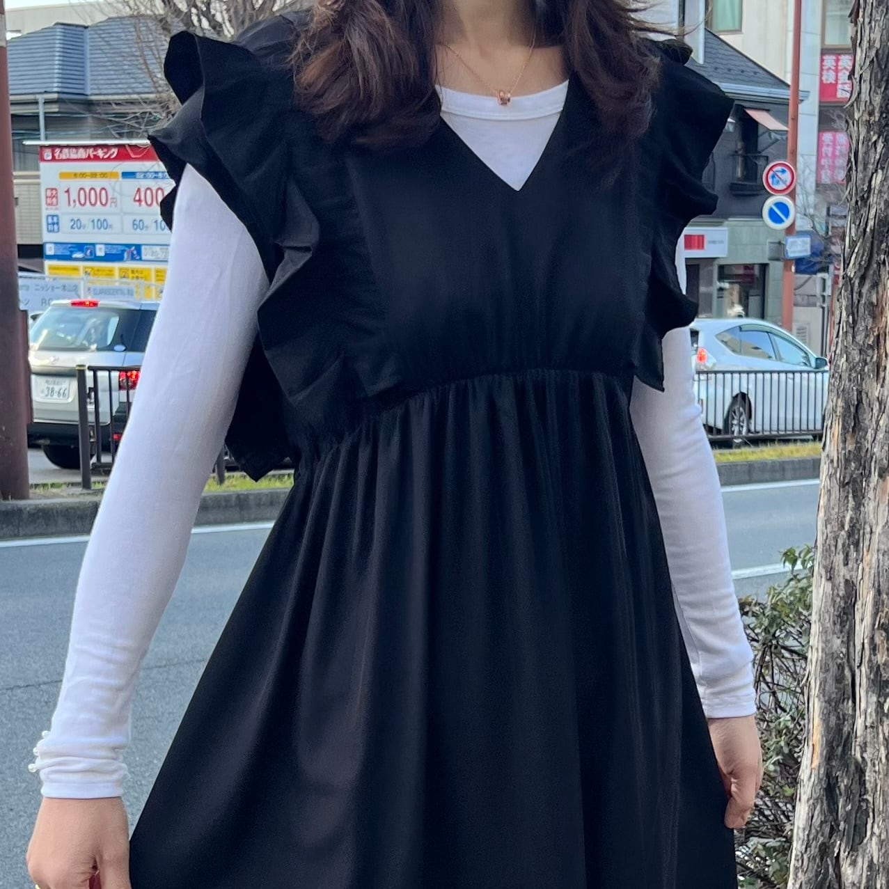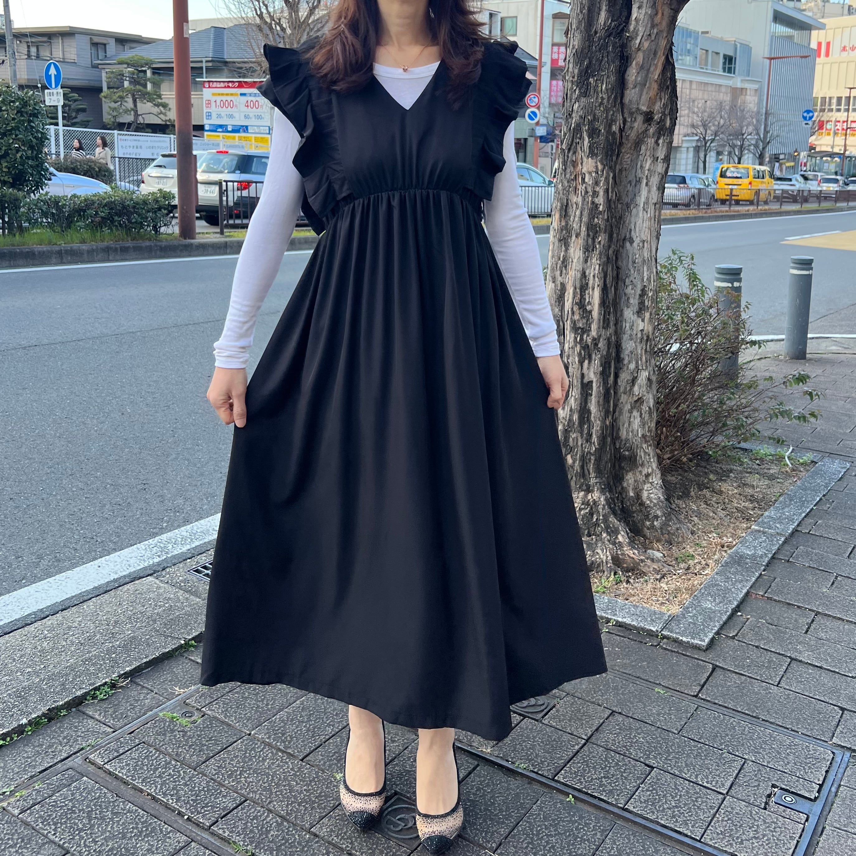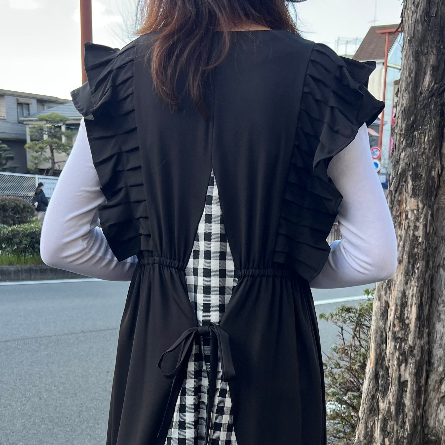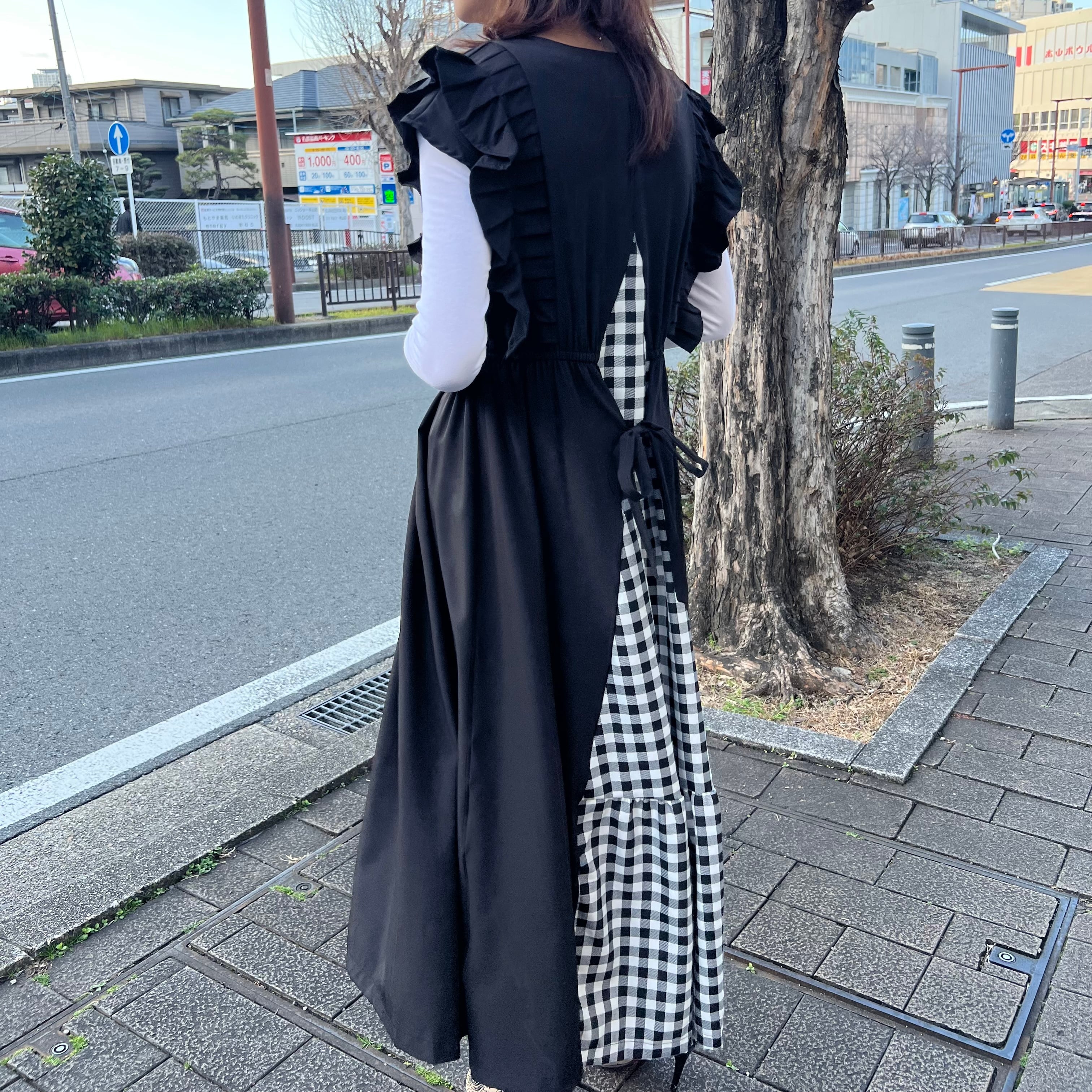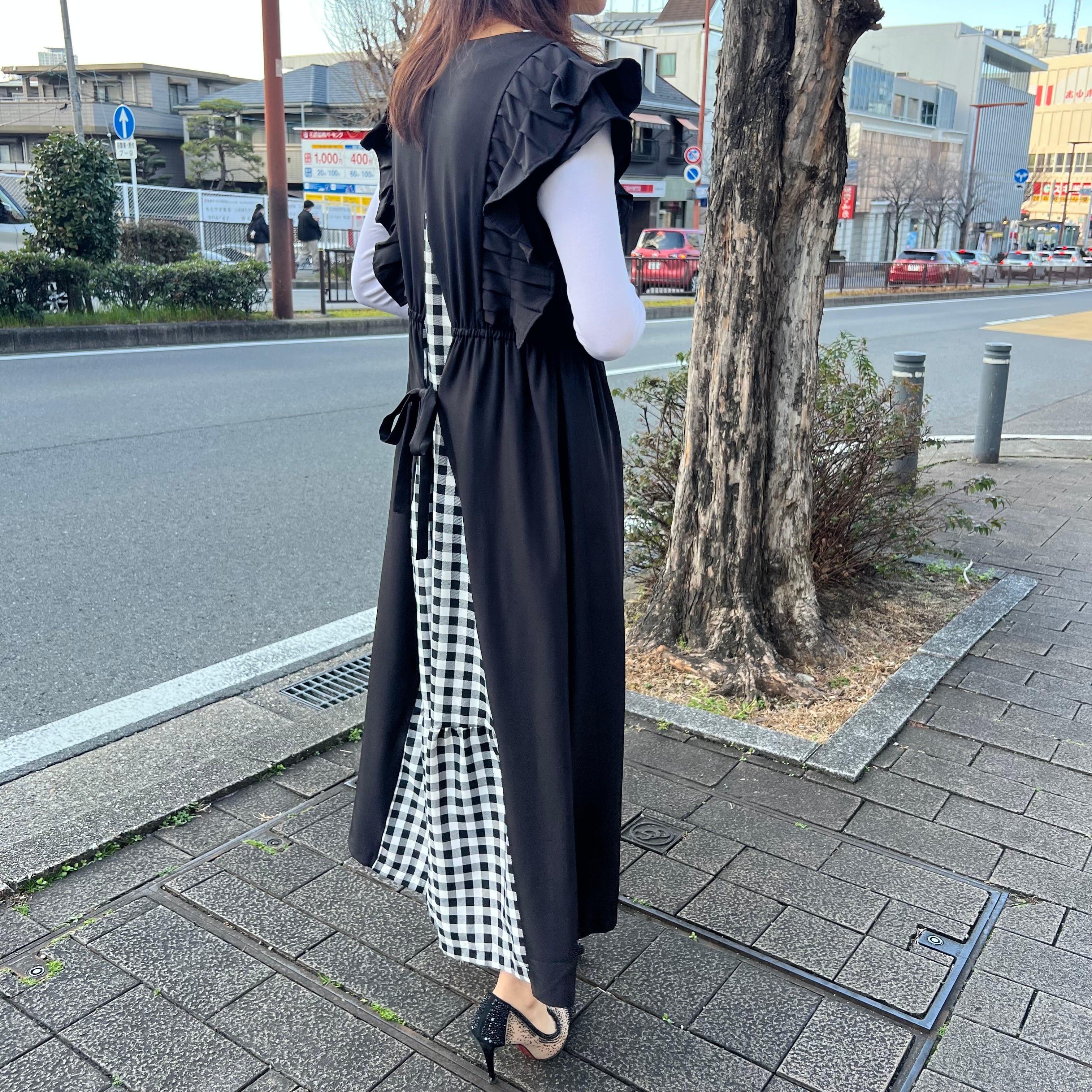 ■バックチェック肩フリルワンピース