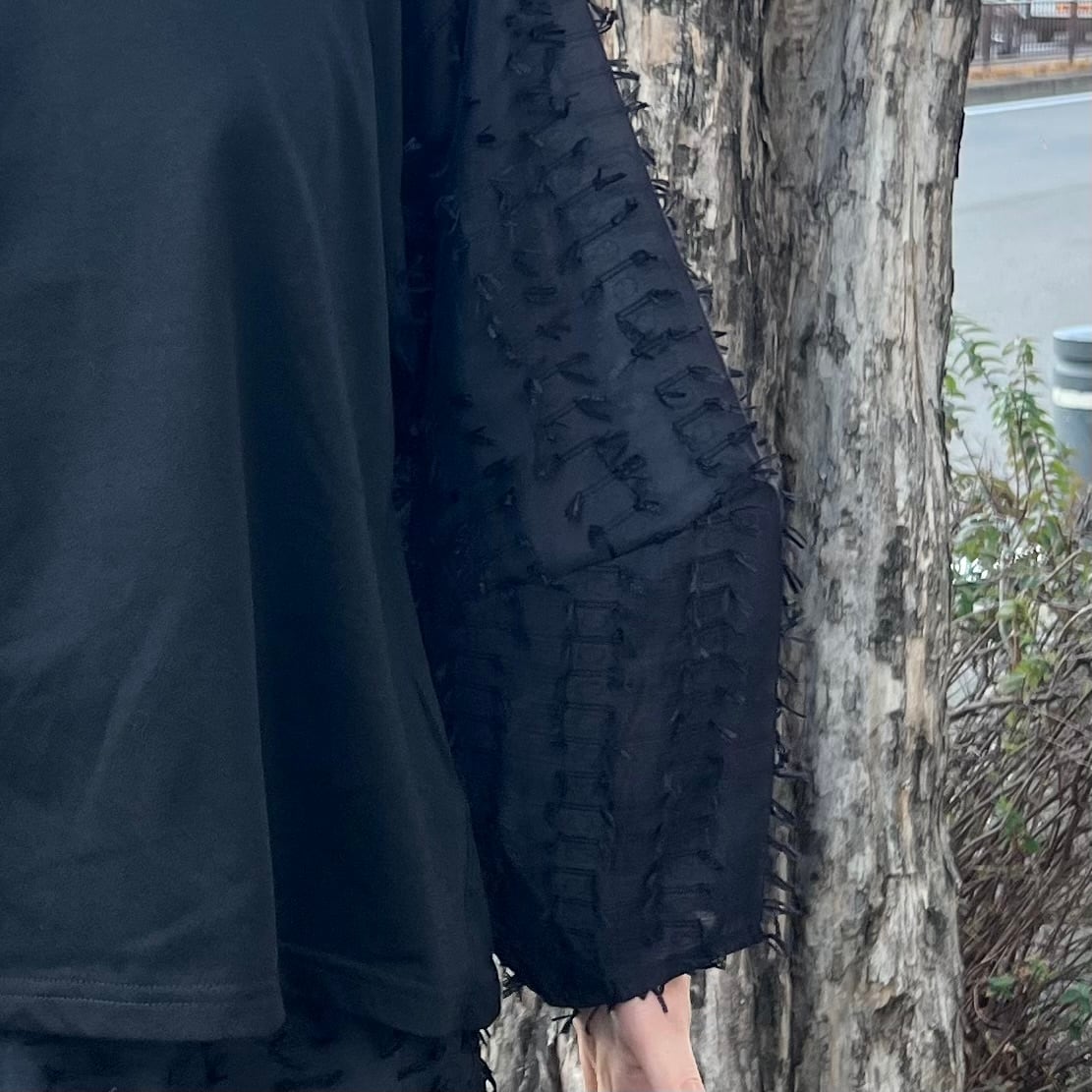 【トップス】リボン生地異素材ドッキングトップス・ブラック