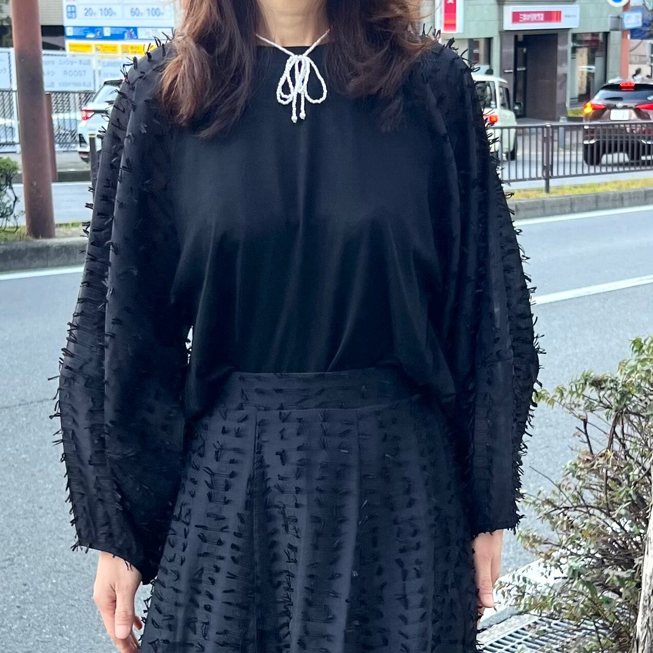 ■リボン生地異素材ドッキングトップス・ブラック