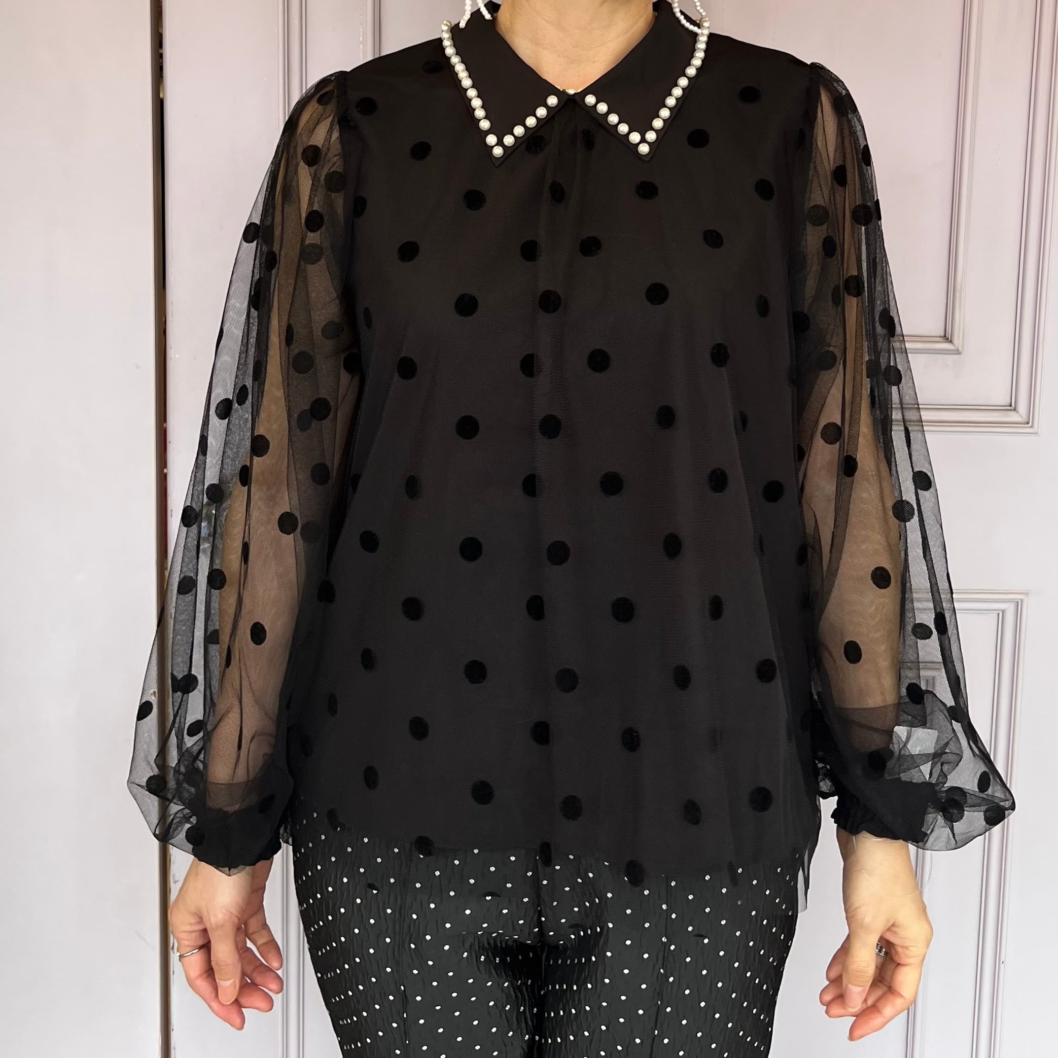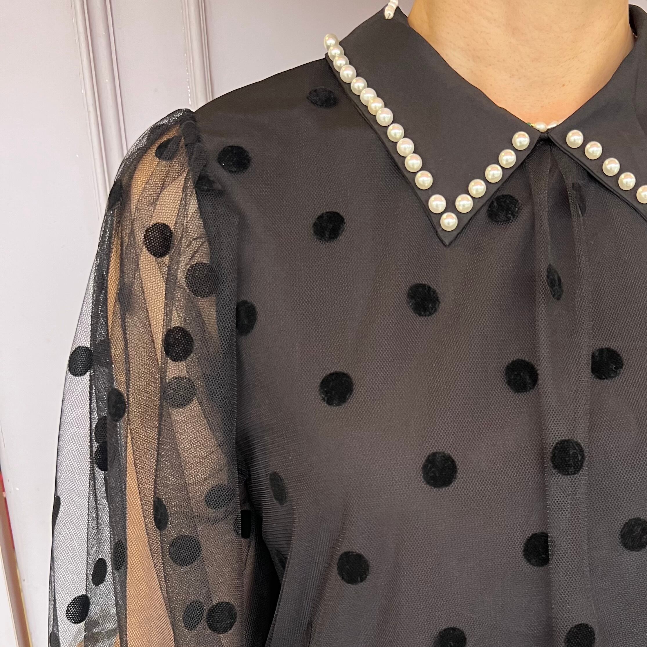 ■フロッキードット襟パールトップス・ブラック
