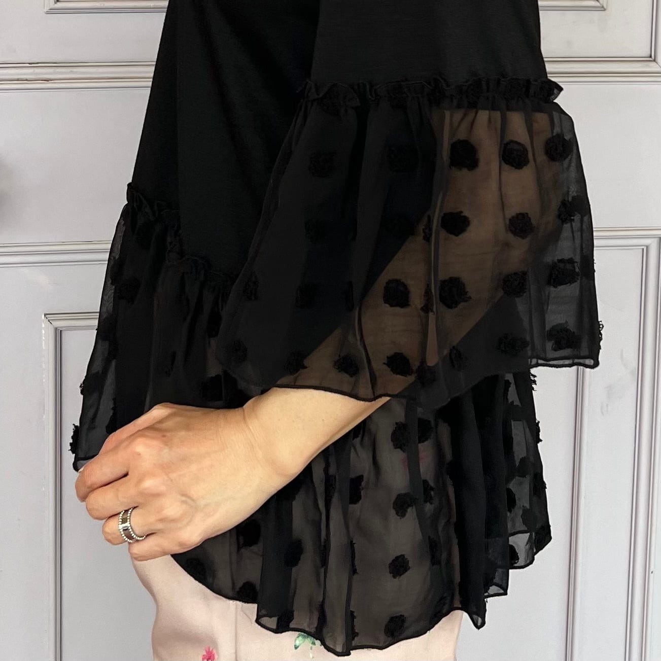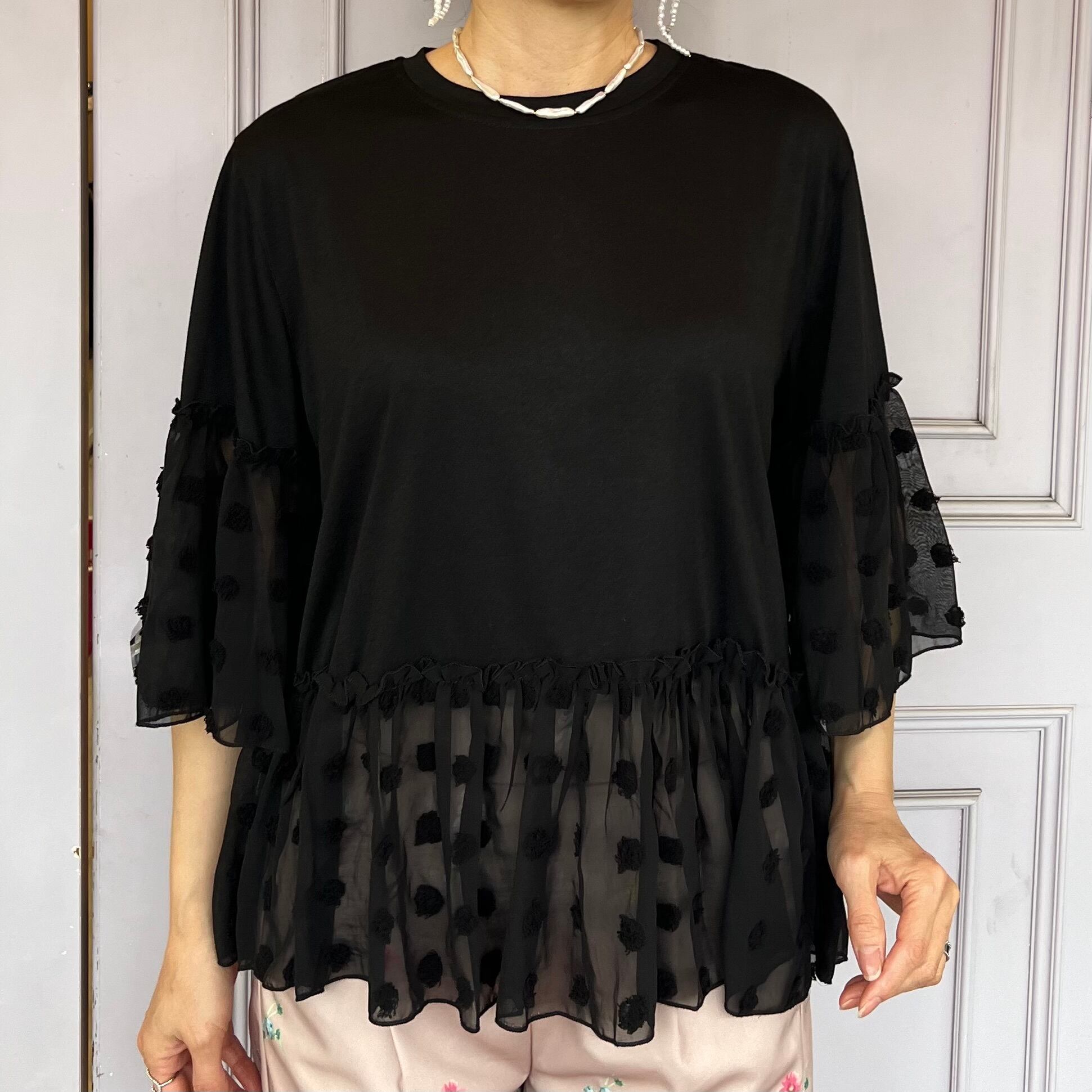 【トップス】裾袖フリルドットTシャツ・ブラック