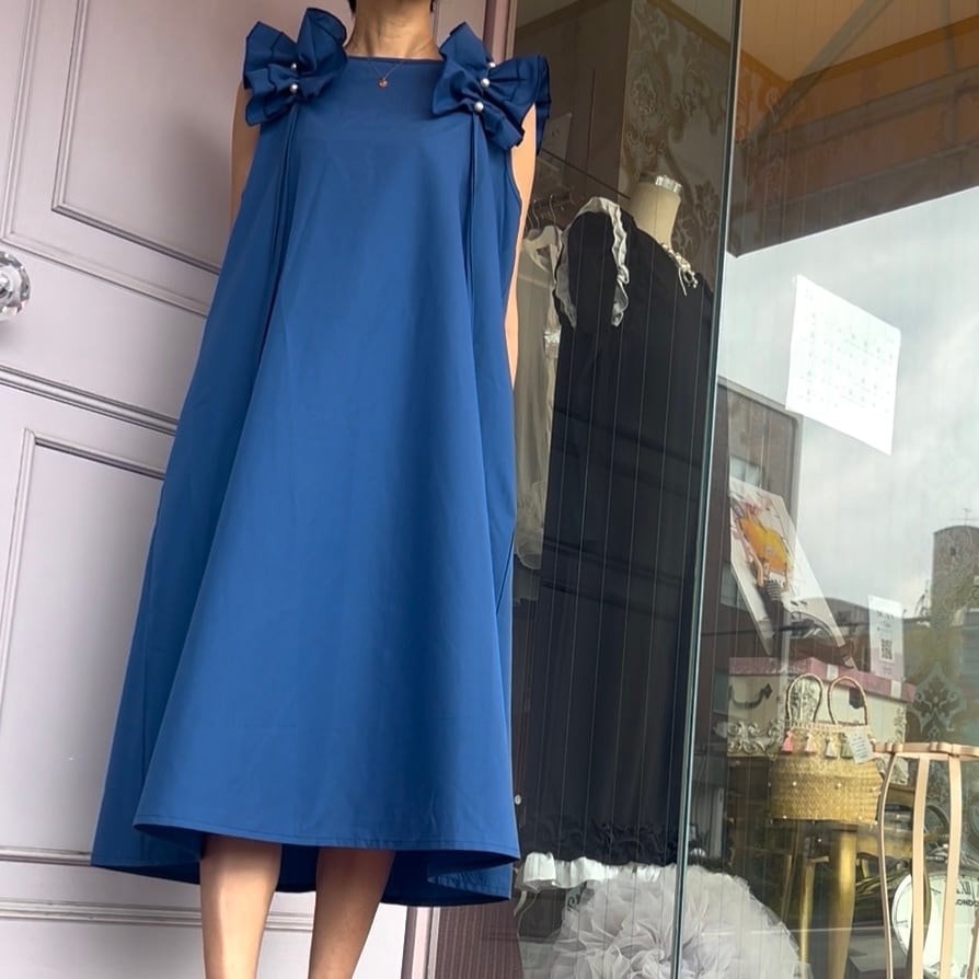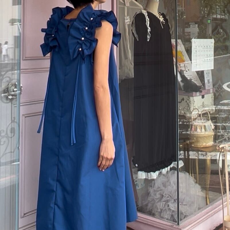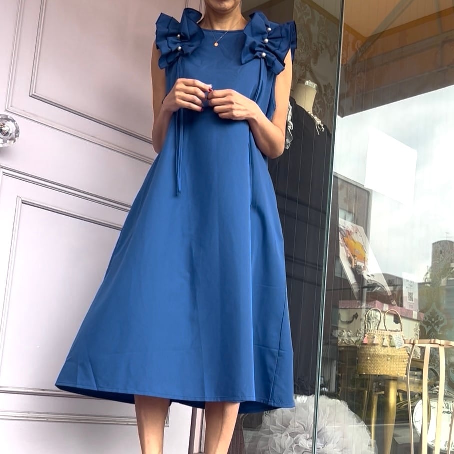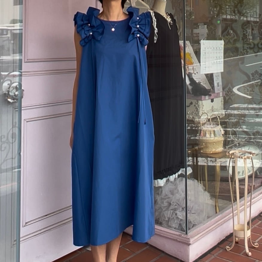 ■肩フリルパール付きワンピース・ブルー
