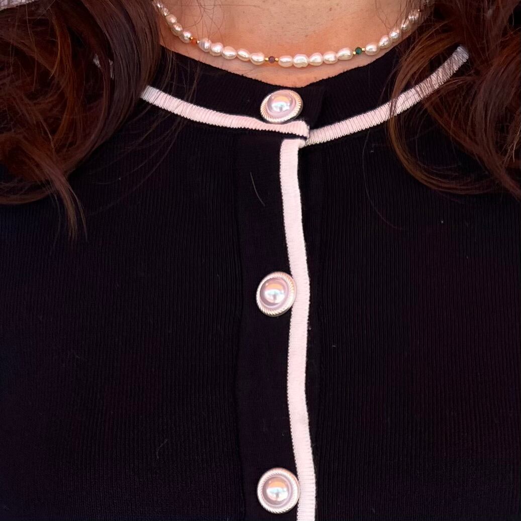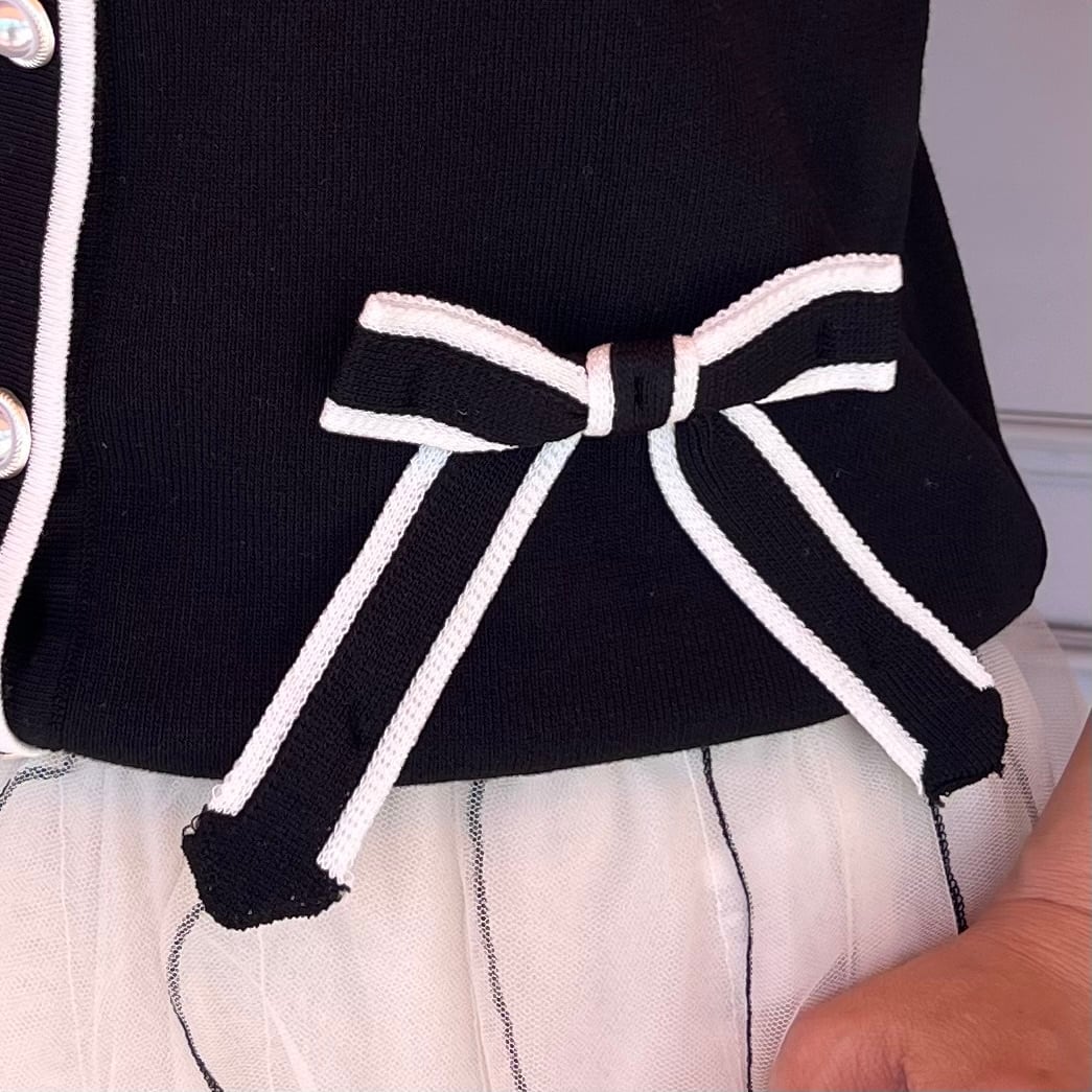 配色ラインとリボンデザインがポイントのニットカーディガン。