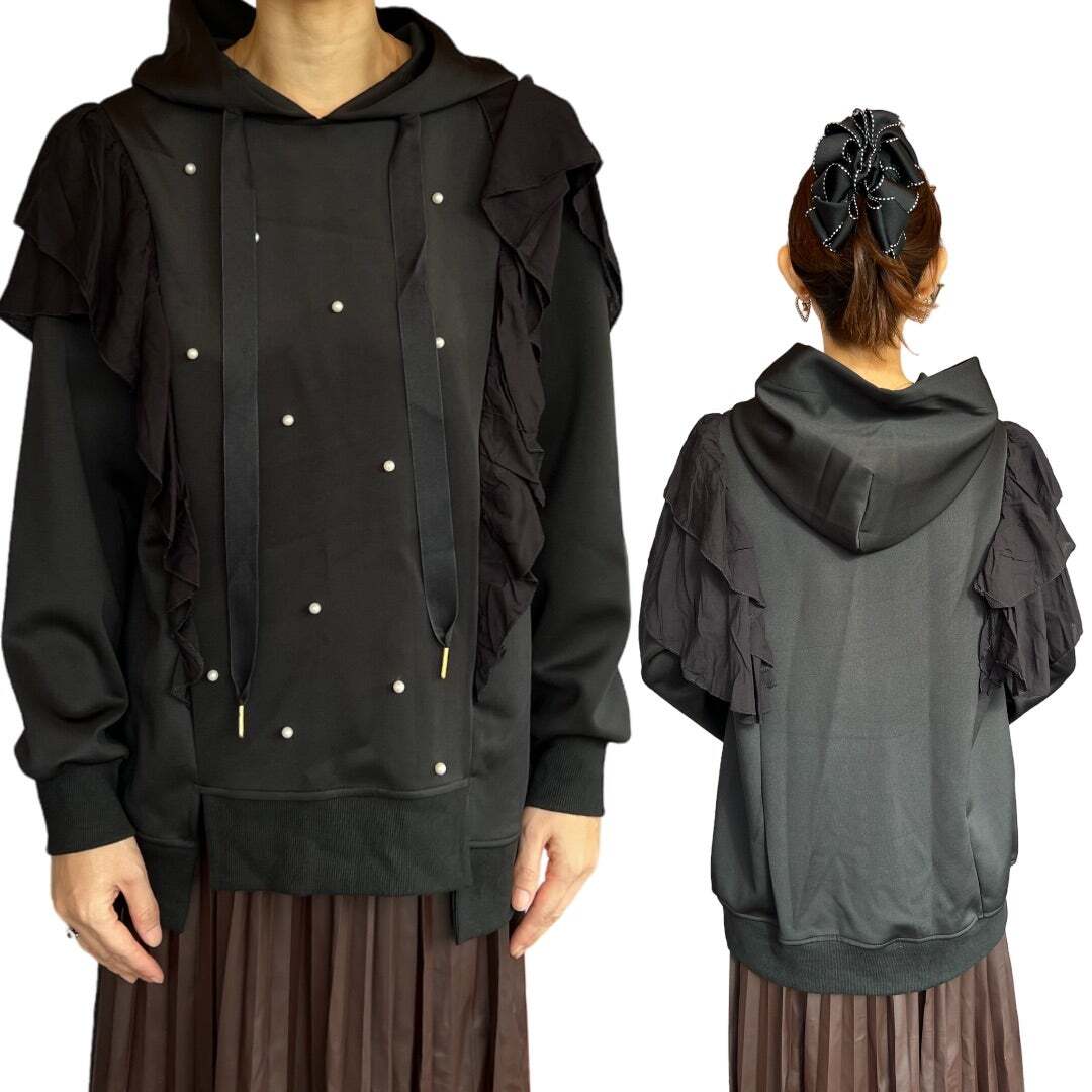【トップス】ダイバー素材 フリル付きフーディー・ブラック