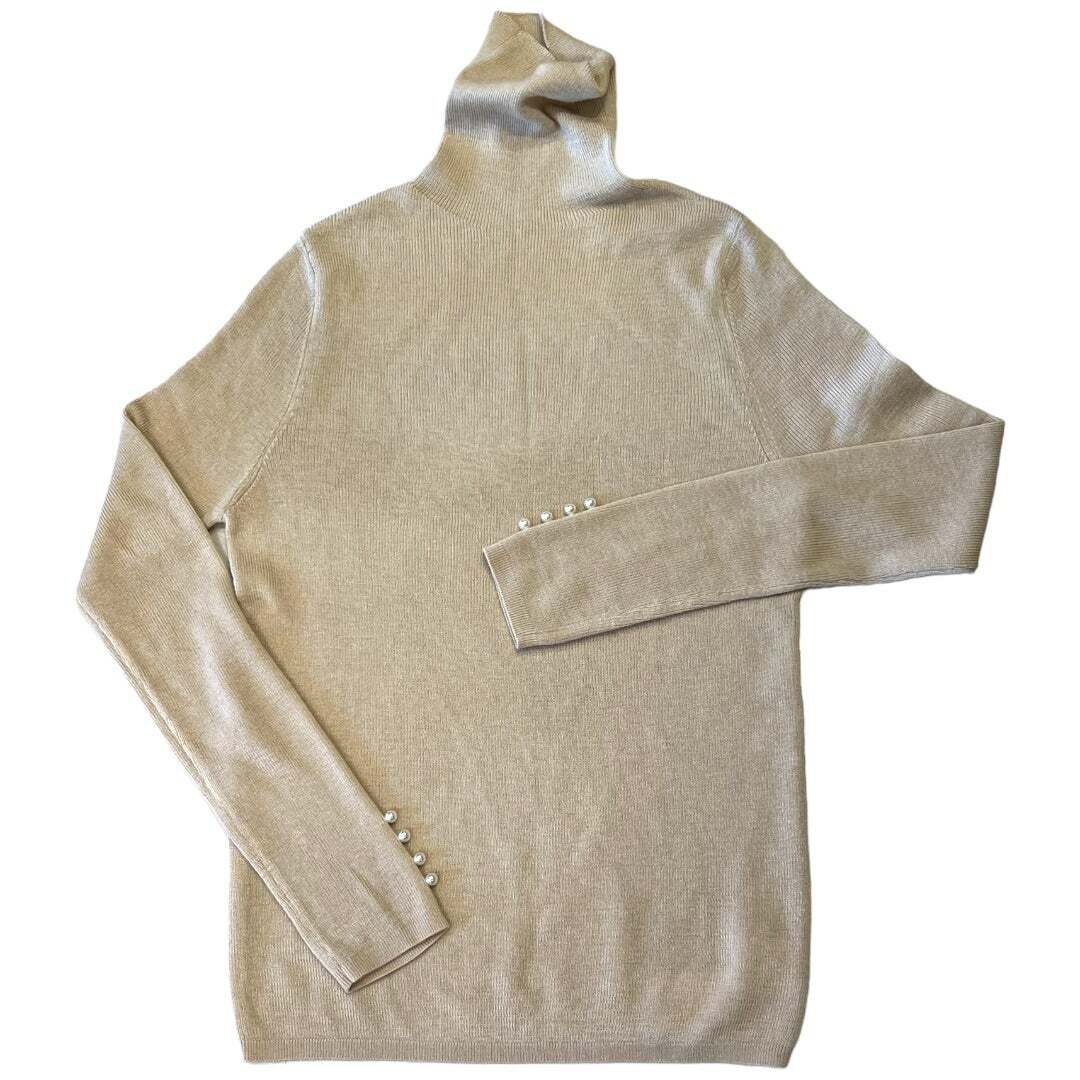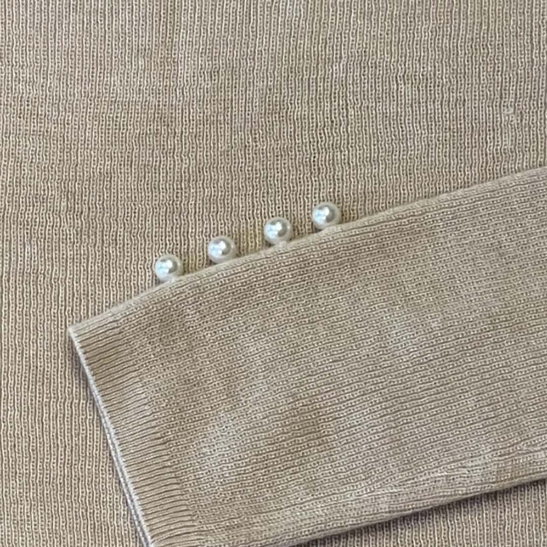 とろみ感のある薄手ニットに、お袖パールが華やかさを添えるタートルネック。