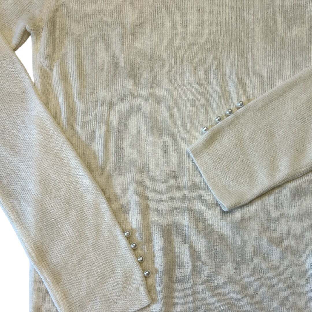 とろみ感のある薄手ニットに、お袖パールが華やかさを添えるタートルネック。
