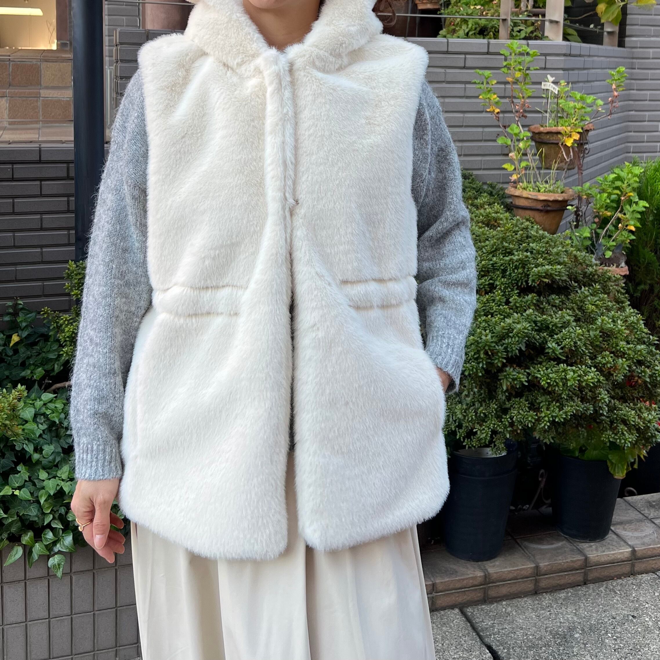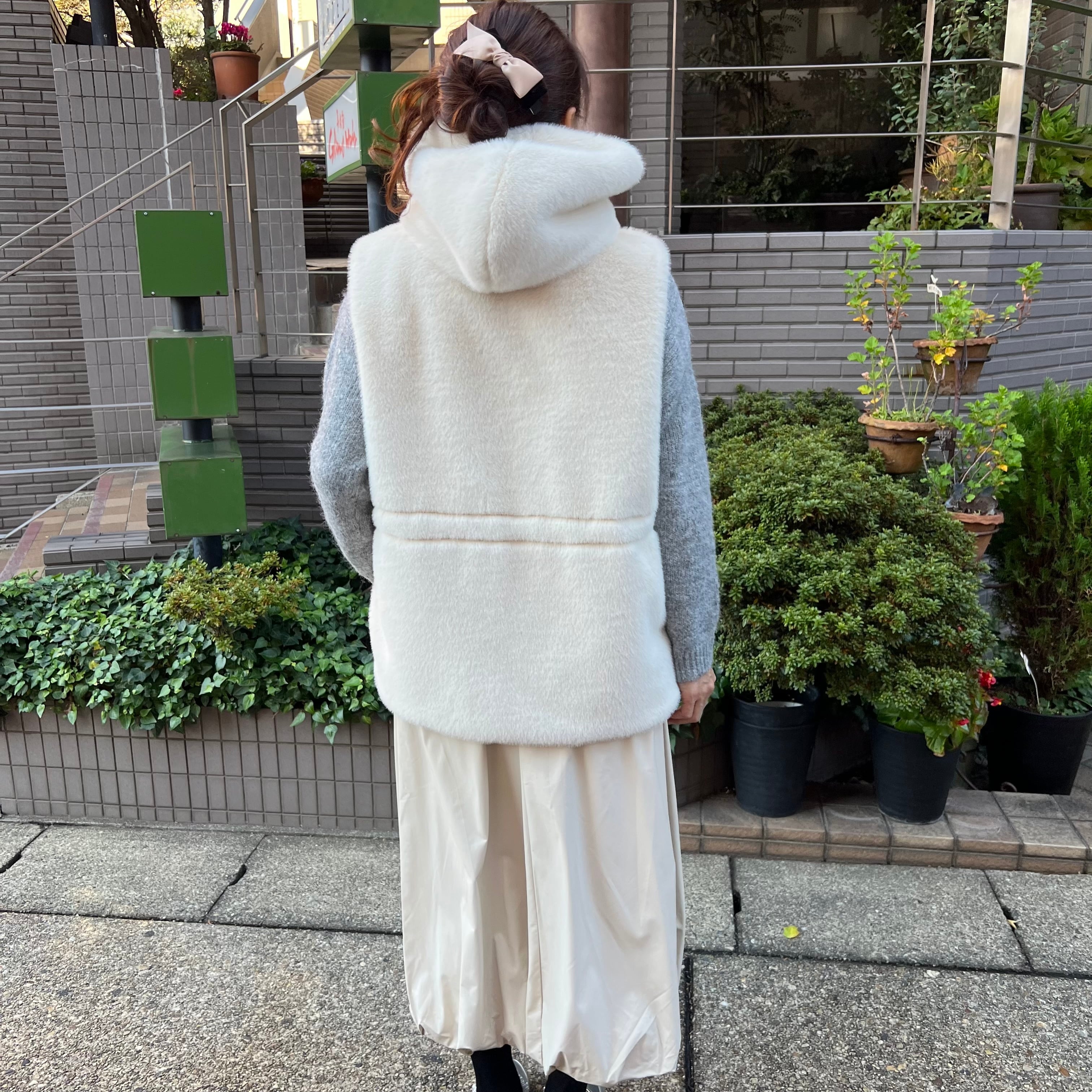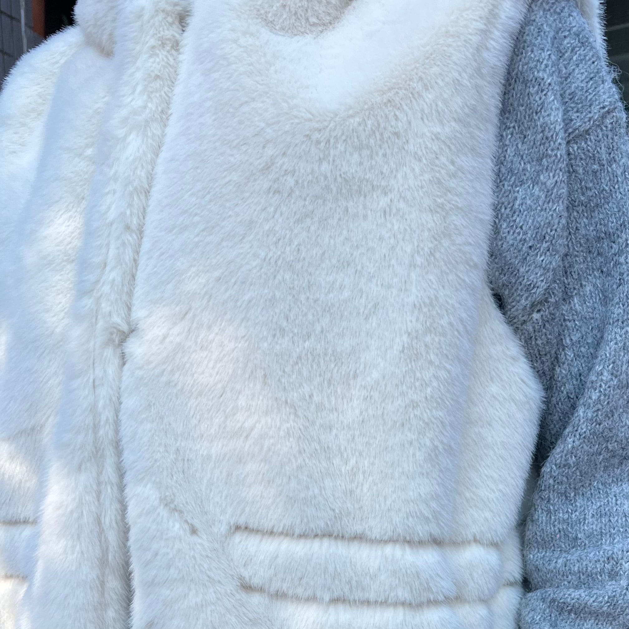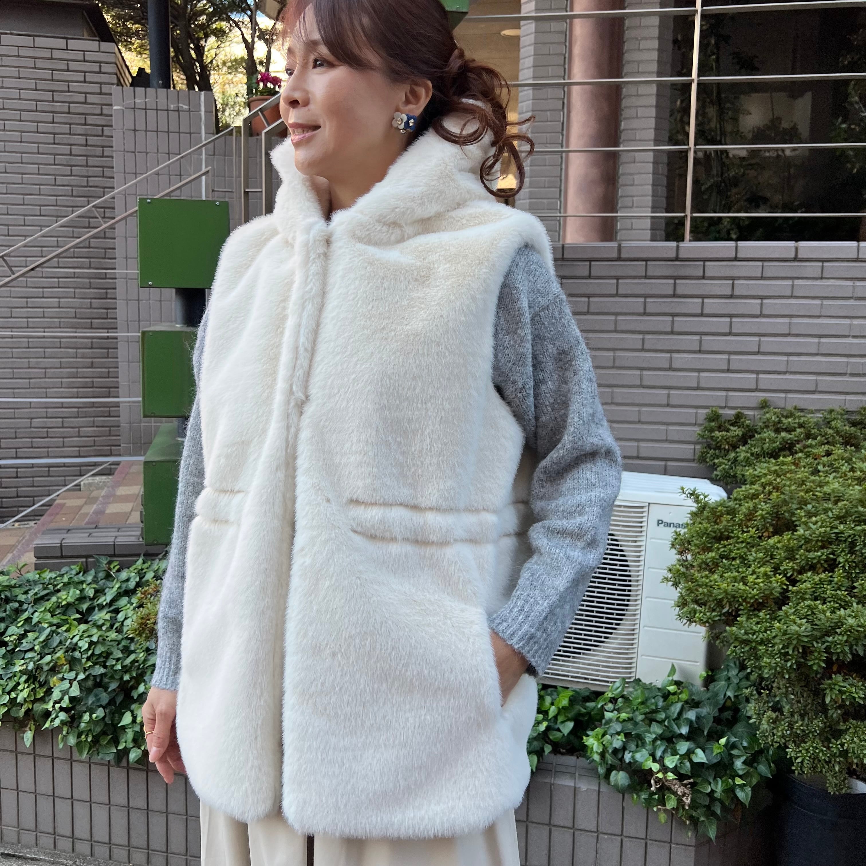 ■ホワイト・フード付きミディアムロング丈エコファー ベスト