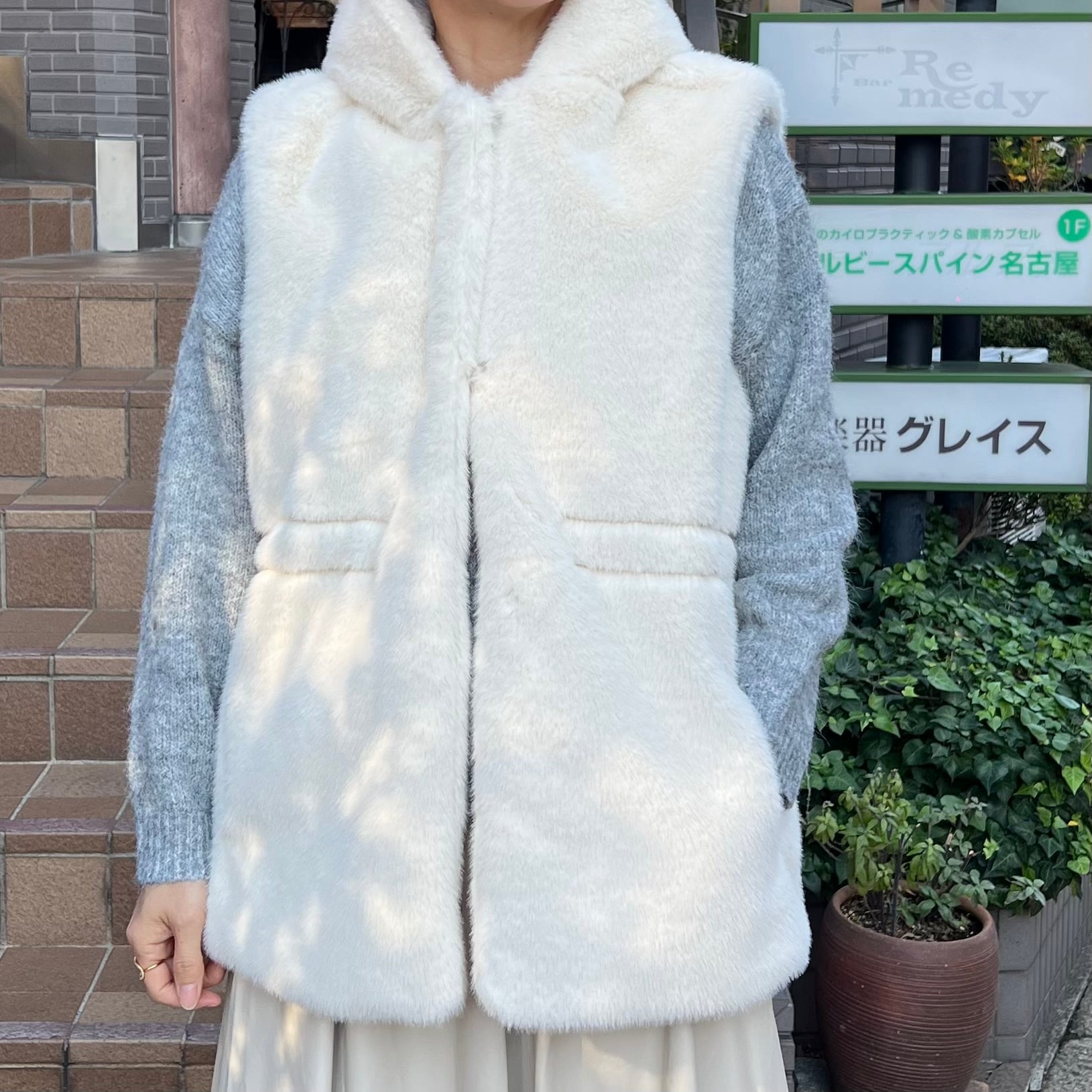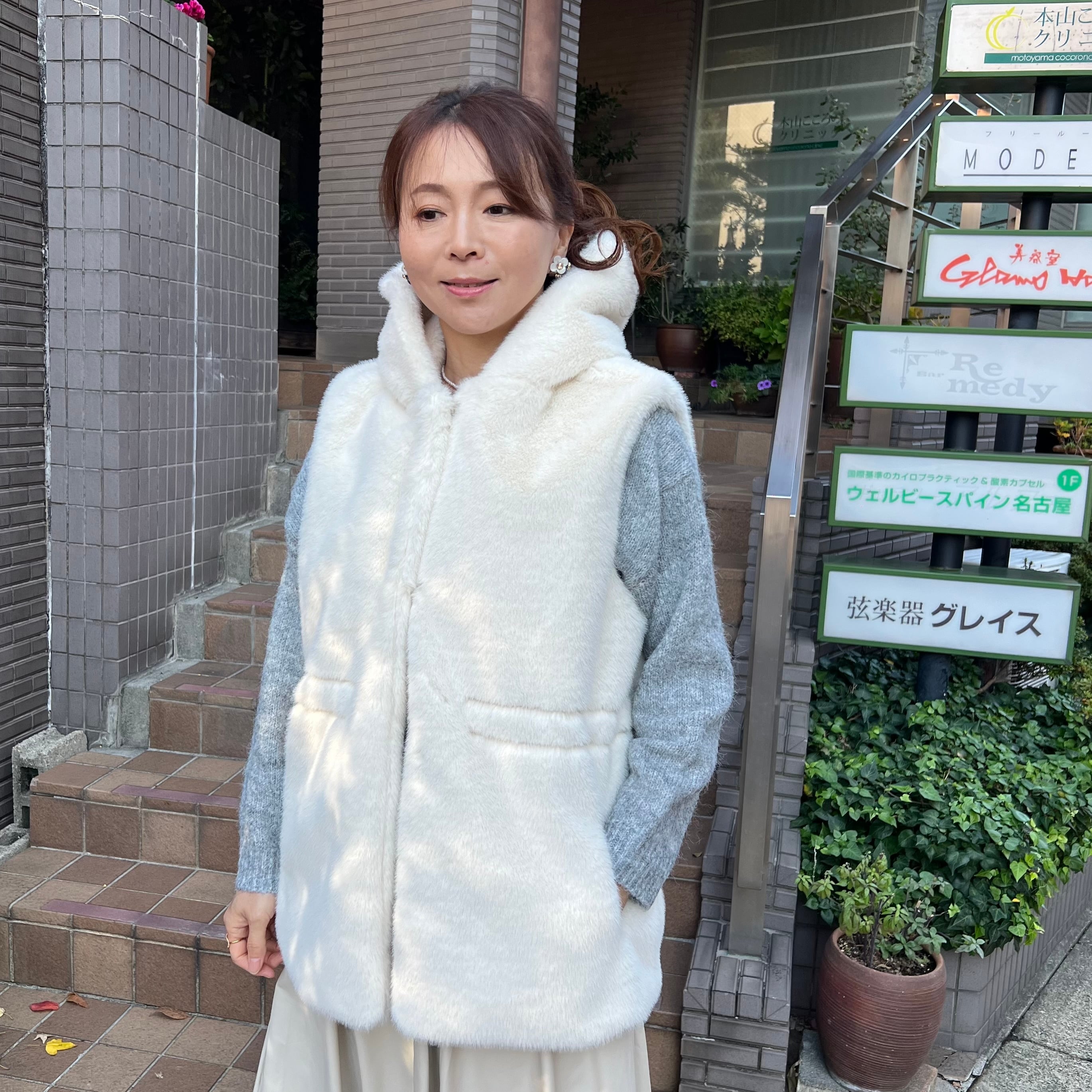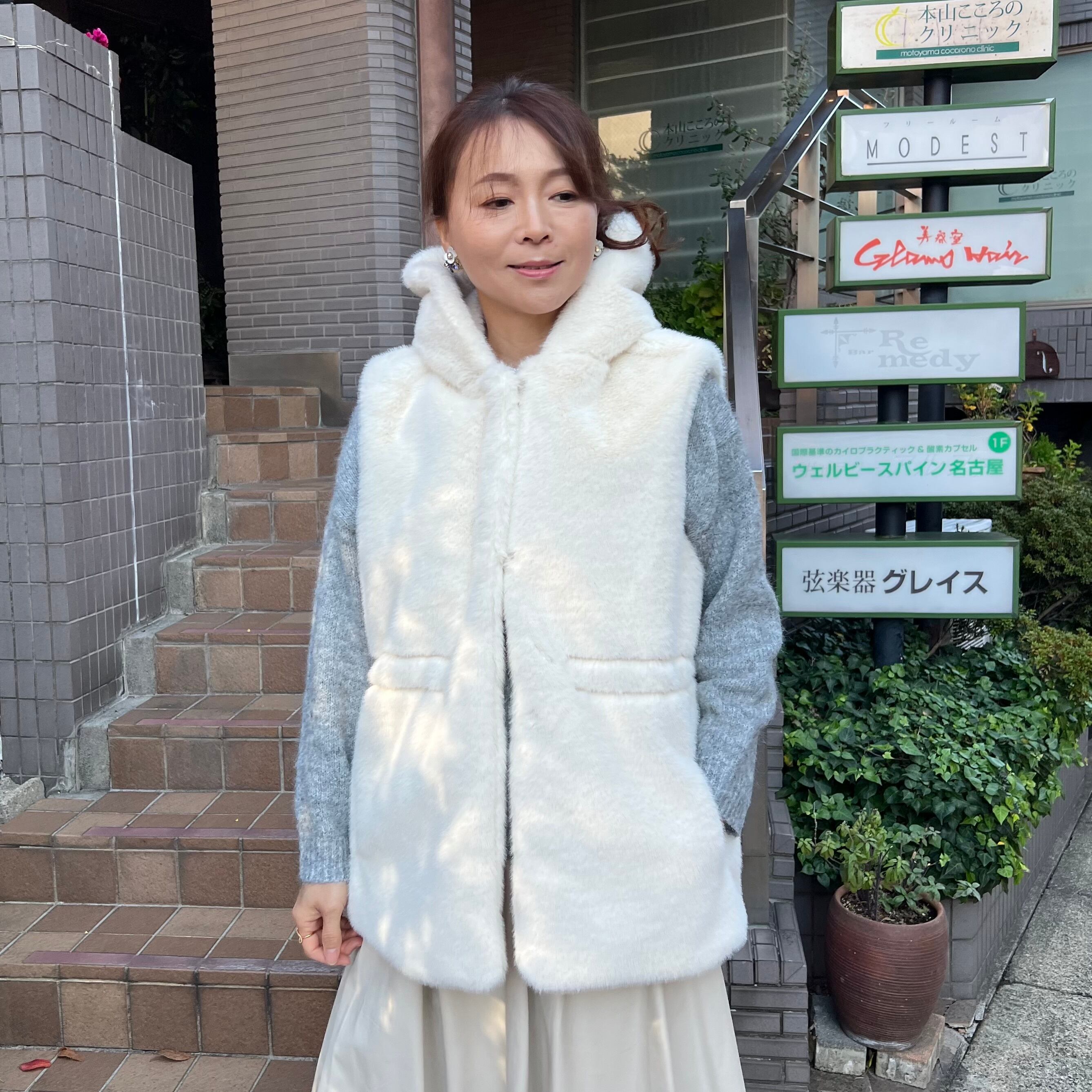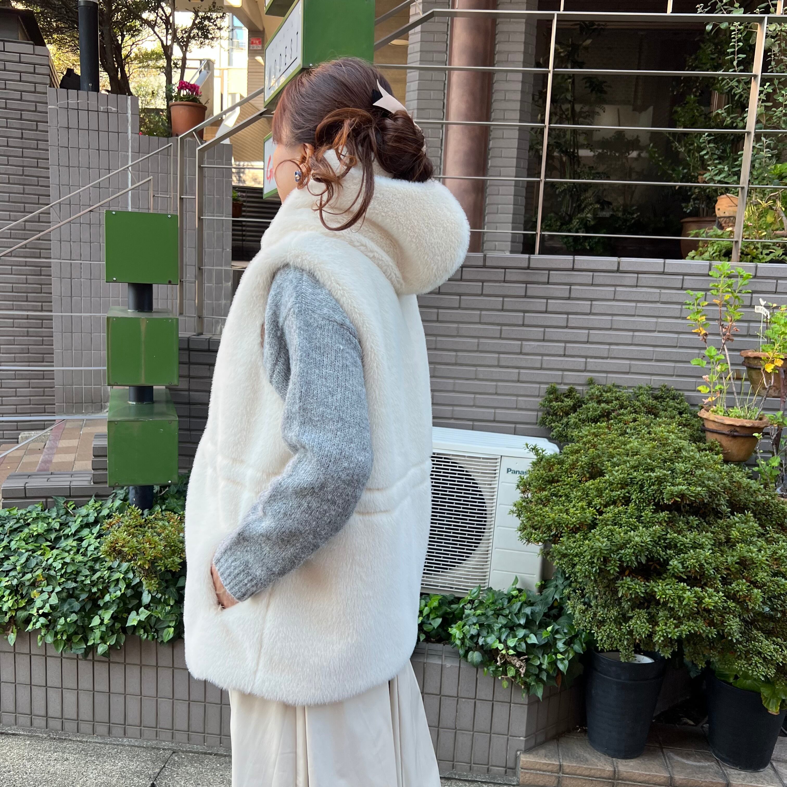 ■ホワイト・フード付きミディアムロング丈エコファー ベスト
